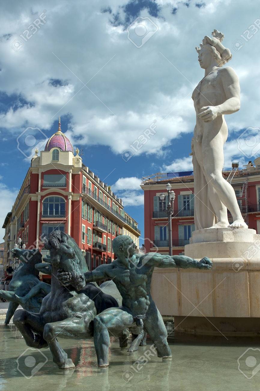 Statue Of Apollo And Fontaine Du Soleil At Place Massena In Nice ...
