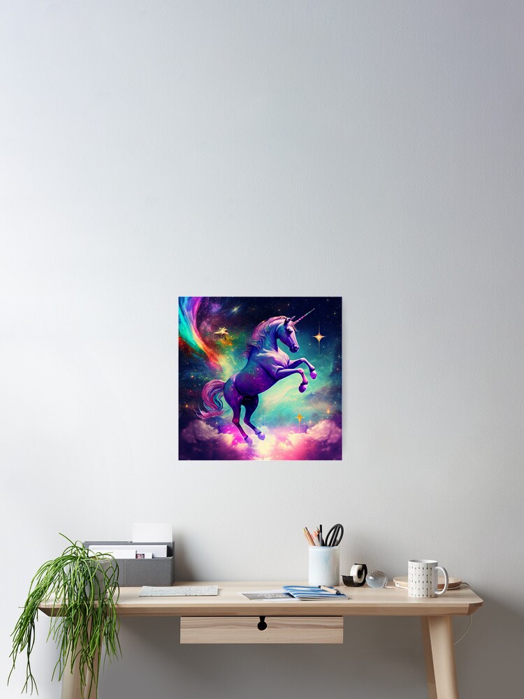 Poster for Sale avec l'œuvre « Licorne arc-en-ciel de l'espace lumineux » de l'artiste MythicPrompts | Redbubble