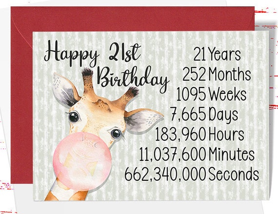 Carte de 21 ans, 21 ans, mois, semaines, jours, carte de voeux d' anniversaire, jolie girafe, carte de 21 ans - Etsy France