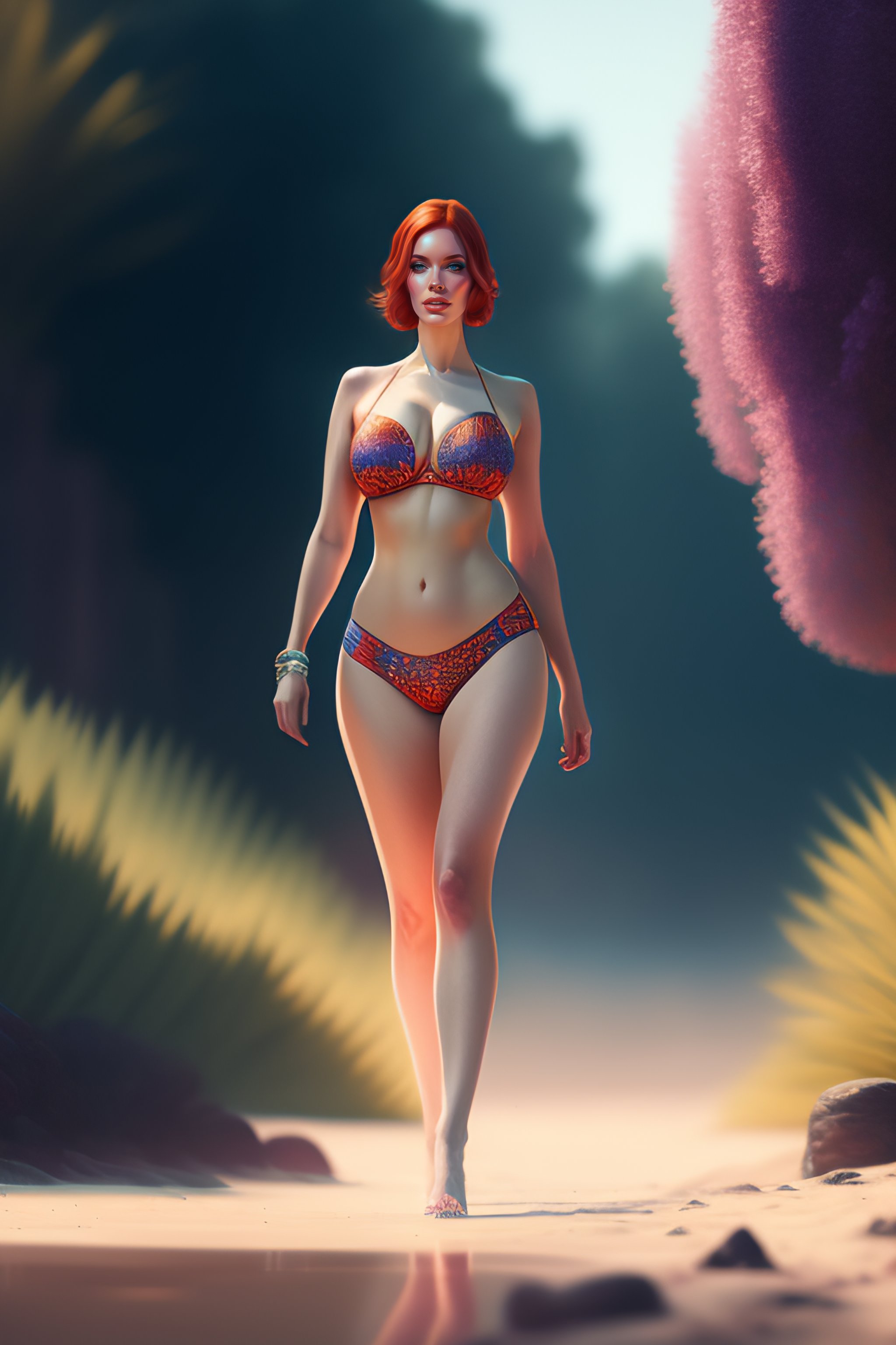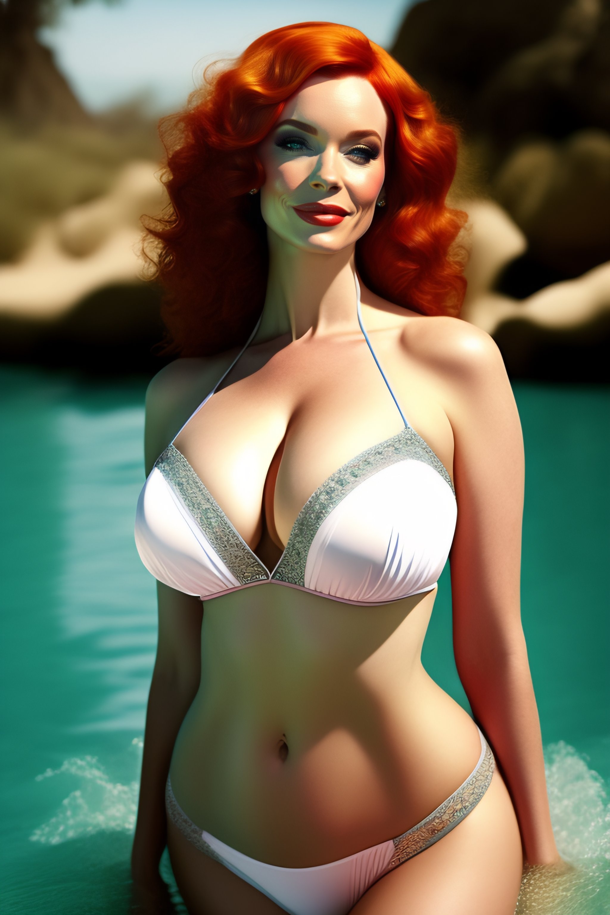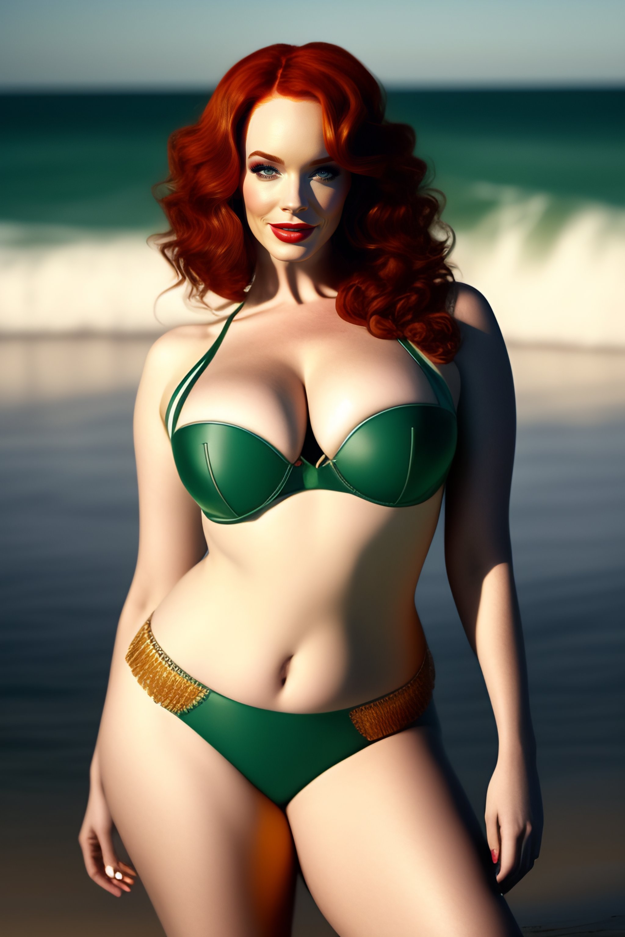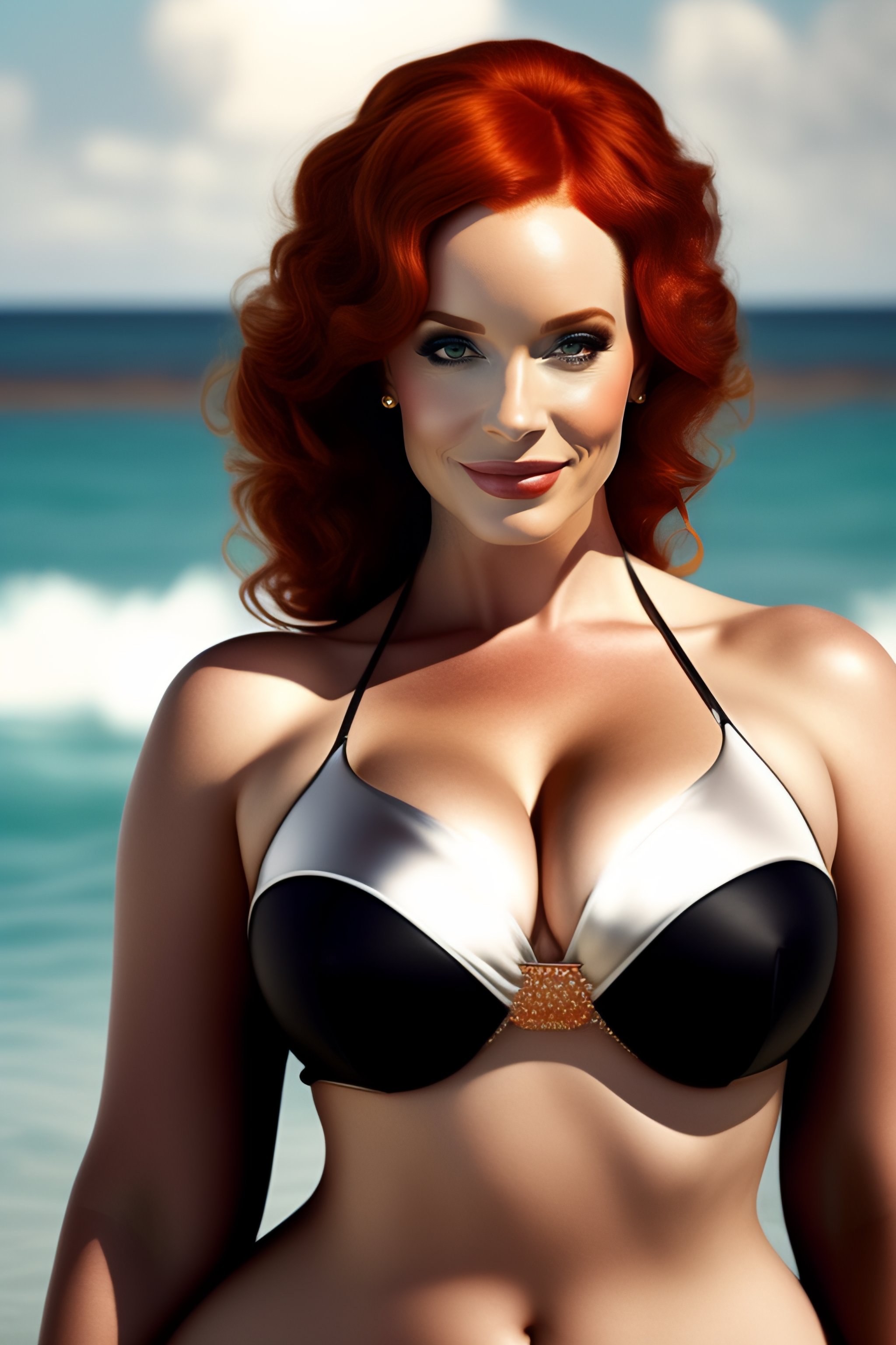 AI Art Generator: Full body Christina Hendricks wearing a two piece swimsuit at the beach