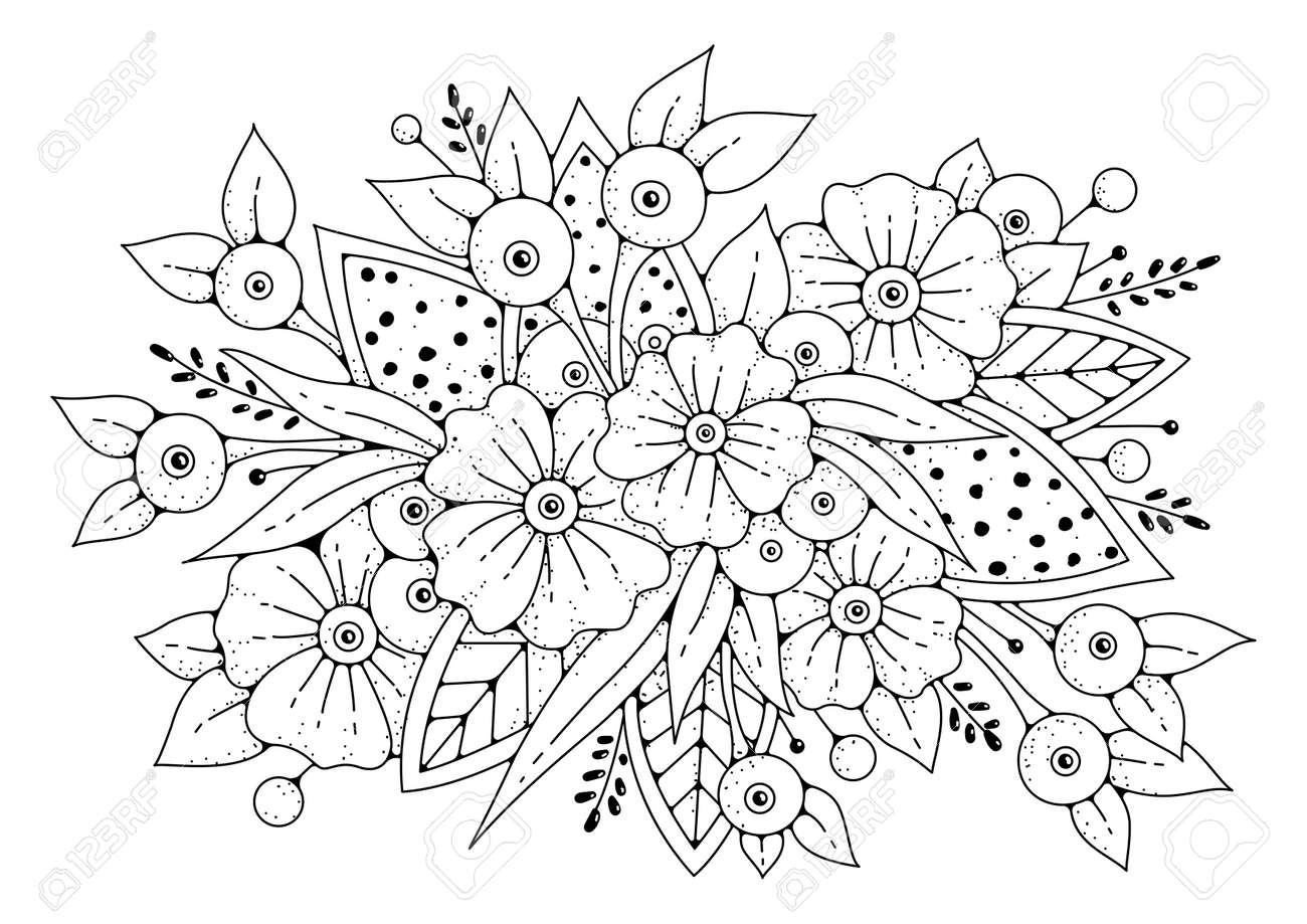 Fleurs De Ligne D'art. Fond Noir Et Blanc À Colorier. Coloriage Pour Enfants Et Adultes. Clip Art Libres De Droits, Svg, Vecteurs Et Illustration. Image 182669930