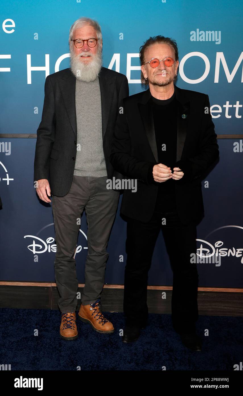 Los Angeles, California, USA. 8th Mar, 2023. David Letterman and Bono. Disney premiere of Bono & The Edge: A Sort of Homecoming, with Dave Letterman held at The Orpheum Theater in Los