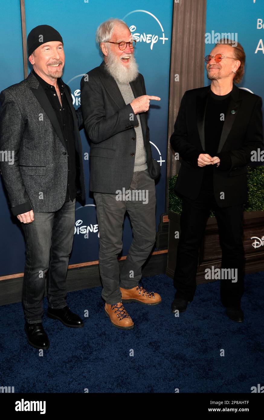 8 March 2023 -Los Angeles, California - The Edge, David Letterman and Bono. Disney+ premiere of Bono & The Edge: A Sort of Homecoming, with Dave Letterman held at The Orpheum Theater