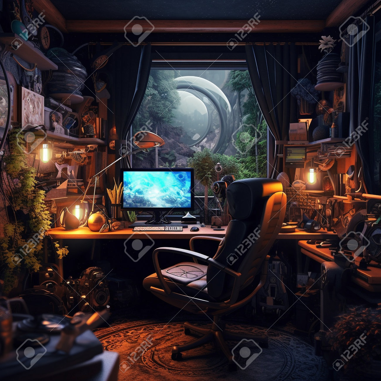 Bureau D'ordinateur 3d Dans Un Bureau Futuriste Avec Lumière ...