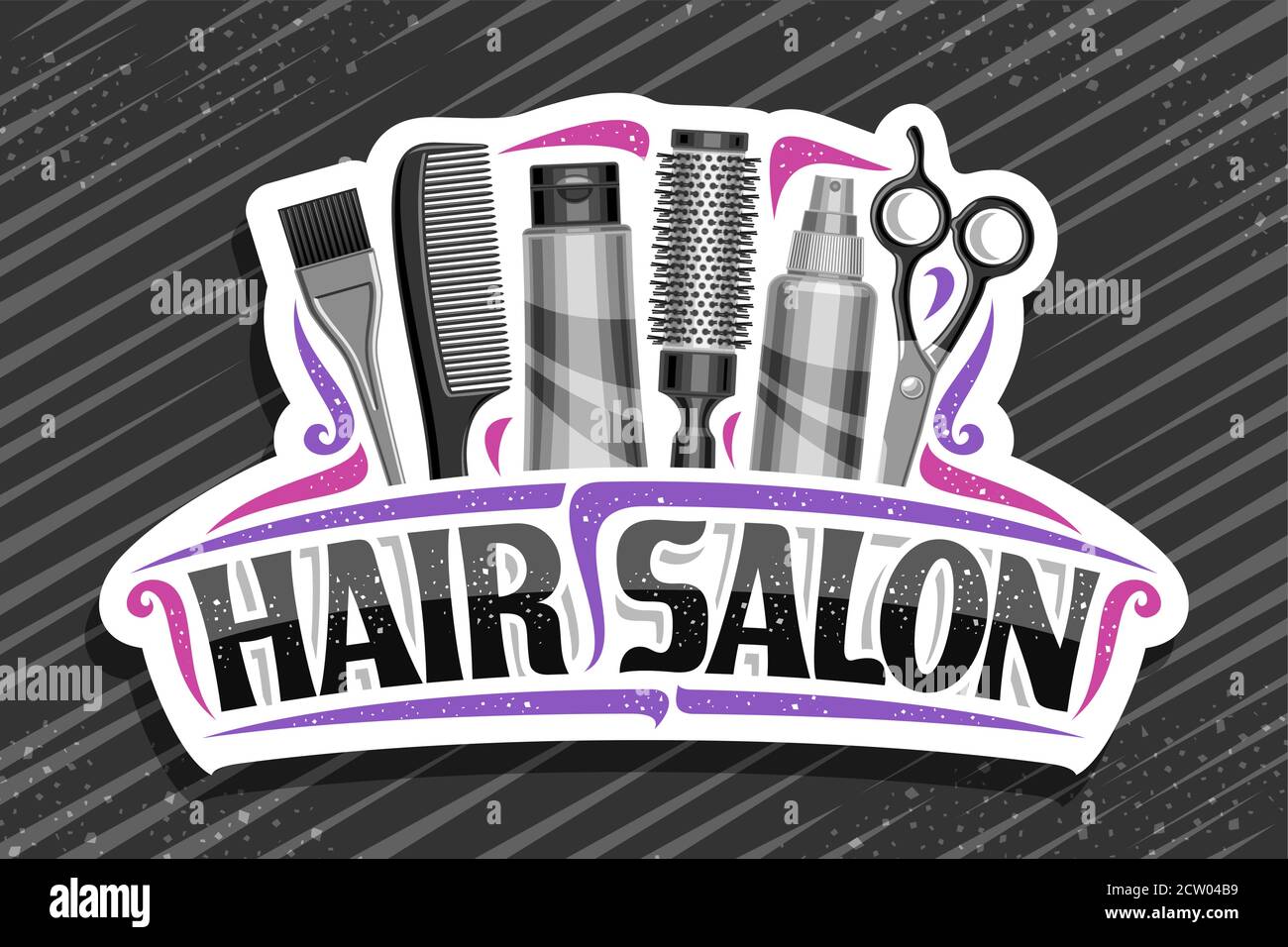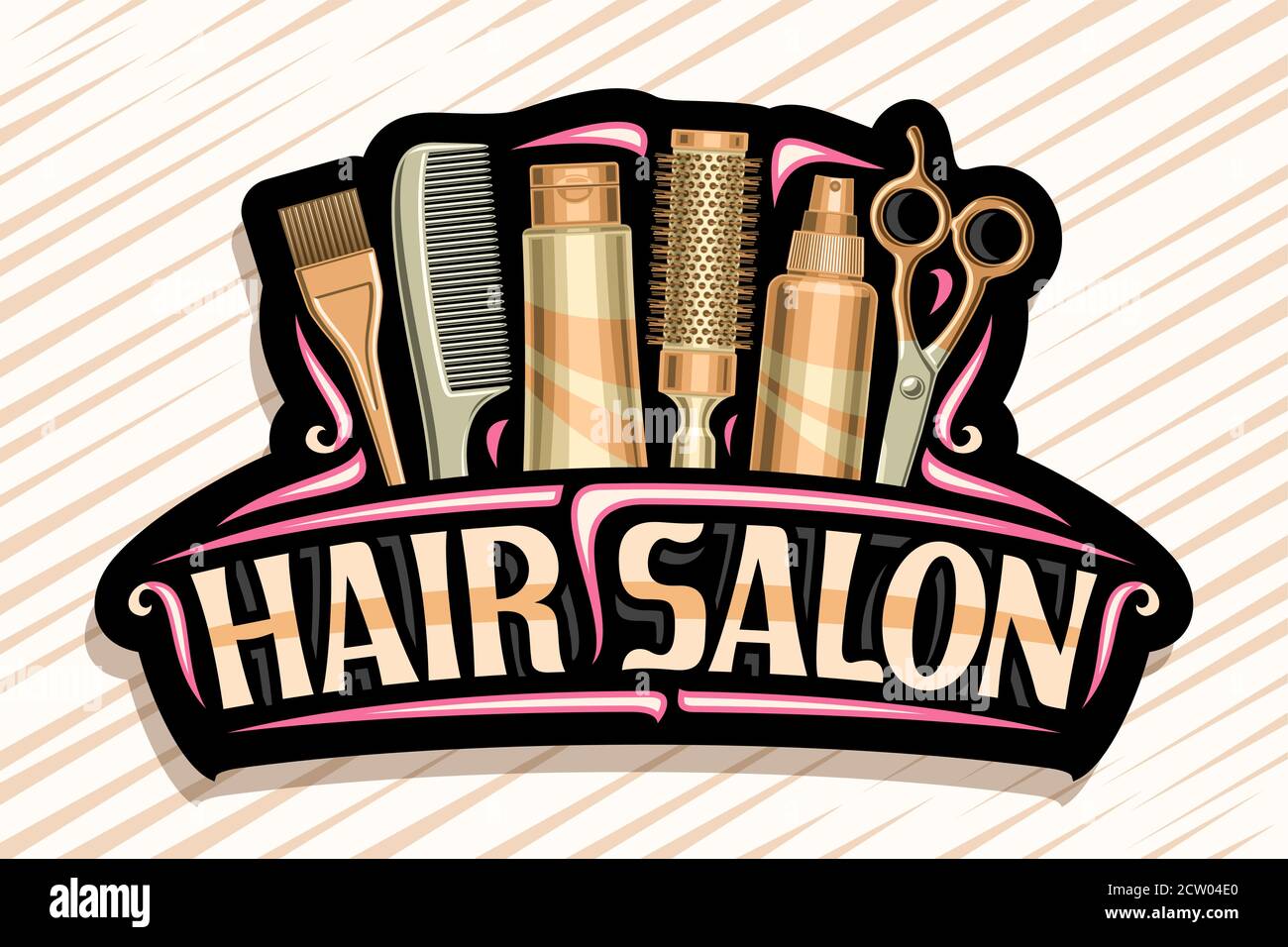 Logo vectoriel pour salon de coiffure, panneau d'affichage décoratif foncé avec accessoires de beauté professionnels, lettres uniques pour les mots bruns salon de coiffure, élégant signe Image Vectorielle Stock - Alamy