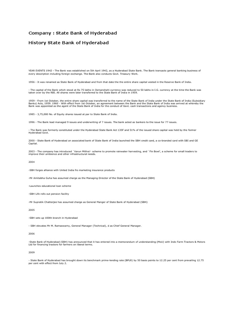 Company: State Bank of Hyderabad History State Bank of Hyderabad | PDF