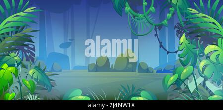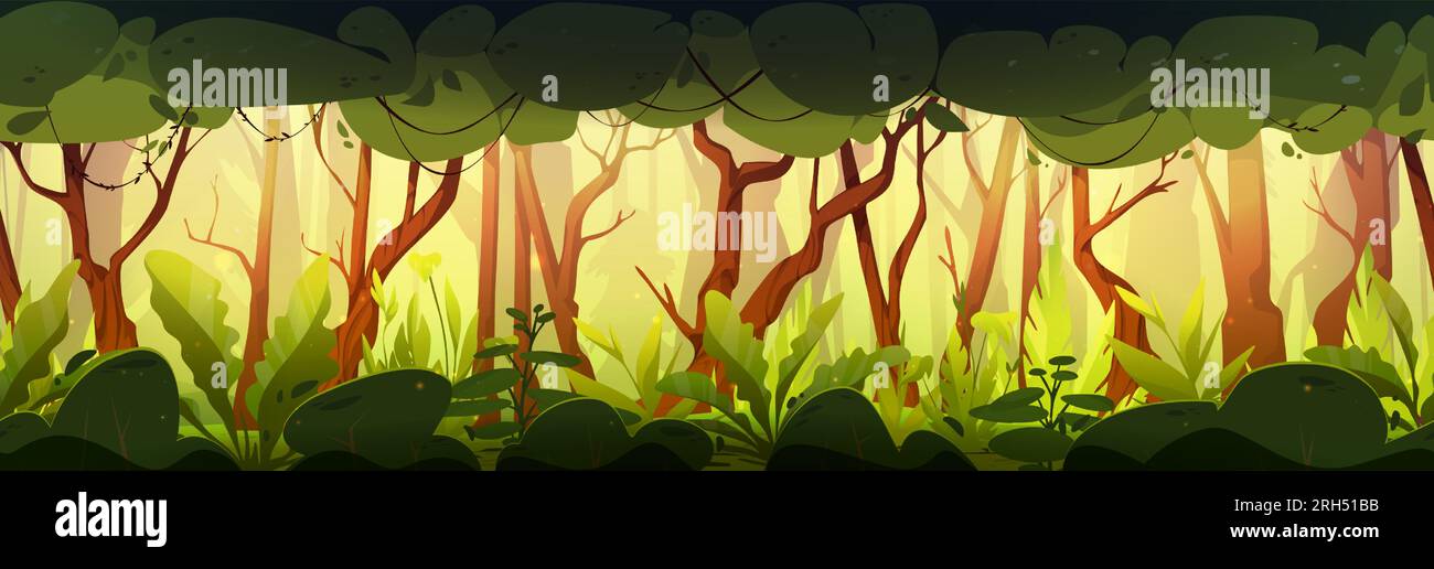 Paysage de jungle ou de forêt tropicale, fond de dessin animé de forêt tropicale, interface de jeu 2D avec effet parallaxe. Papier peint panoramique avec plantes vertes, lia Image Vectorielle Stock -