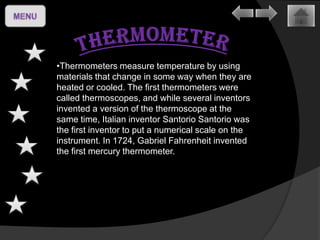 Science - Daniel Gabriel Fahrenheit - He invented the first truly accurate thermometer using mercury instead of alcohol and water mixtures. In the laboratory, he used his invention to develop the first