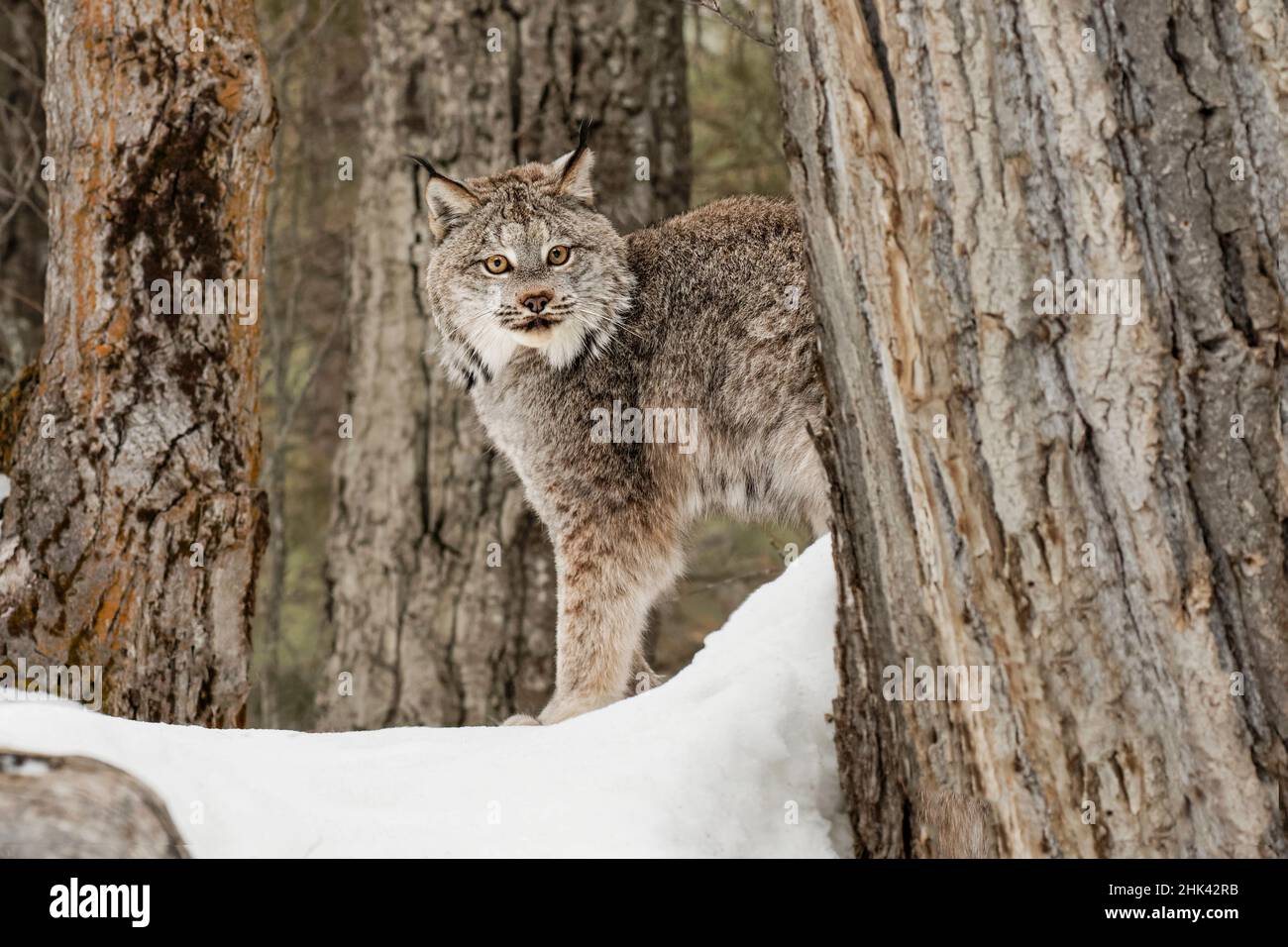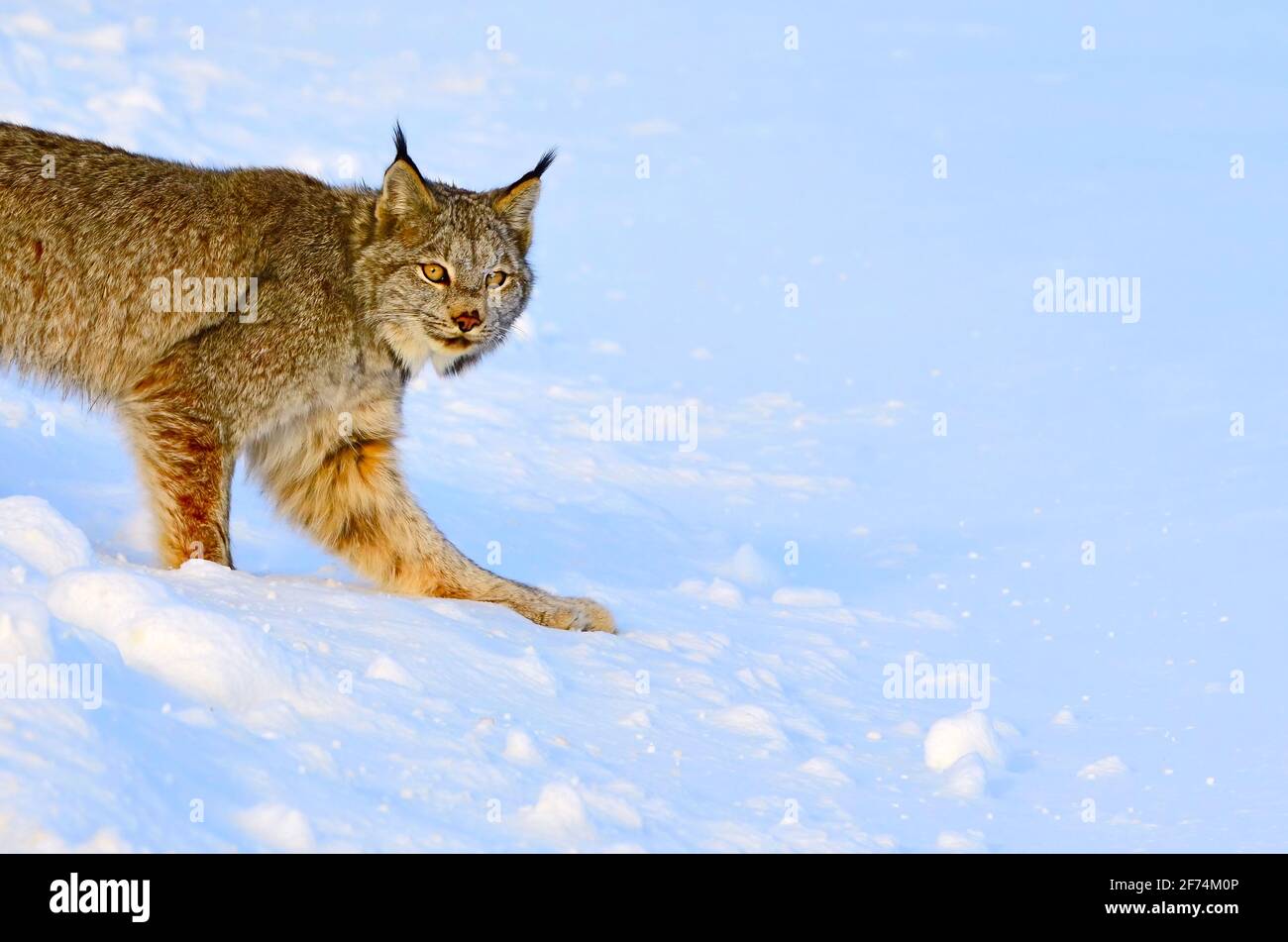 Lynx canadien (Lynx canadensis) adulte, debout sur la neige avec une proie de lièvre d'Amérique (Lepus americanus), Minnesota, É.-U. A. janvier (captif Photo Stock - Alamy