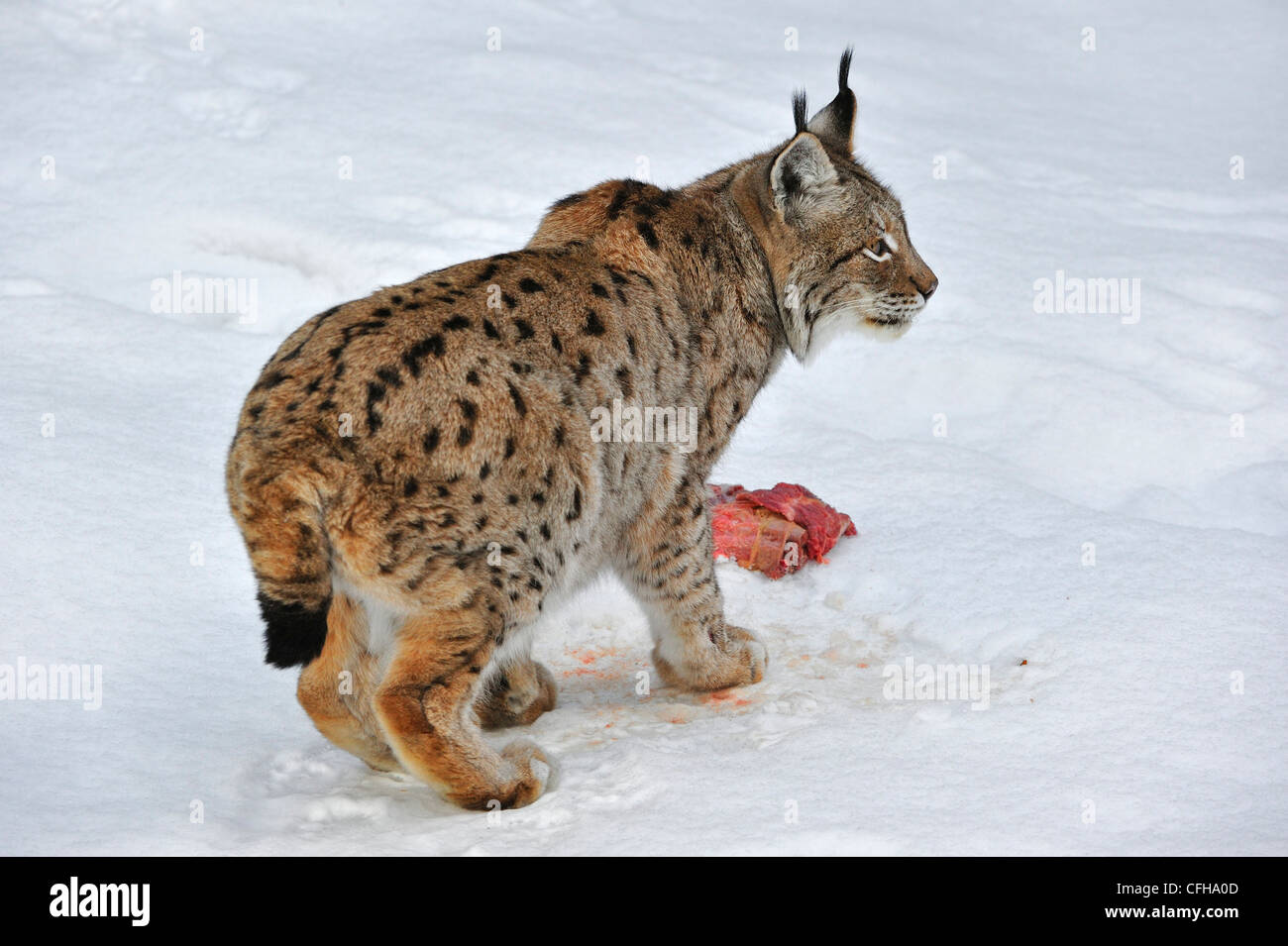 Eurasian lynx (Lynx lynx) eating meat in the snow in winter, Bavarian Forest National Park, Germany Stock Photo - Alamy