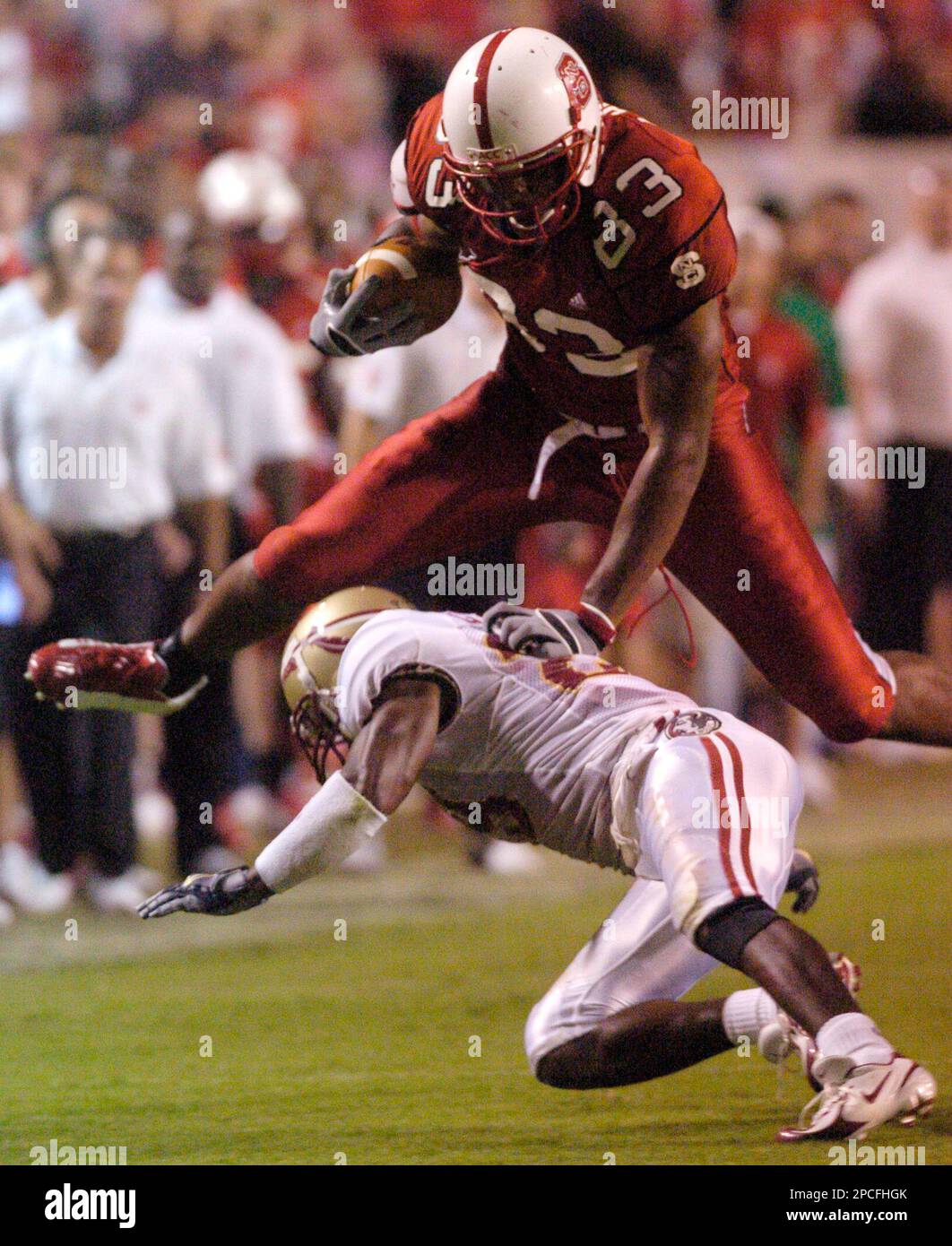 North Carolina State's Anthony Hill (83) hurdles Florida State's Michael Ray Garvin (29) during the second