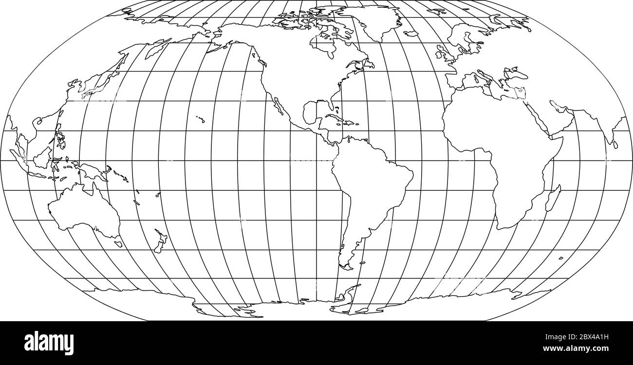 Carte du monde en Robinson projection avec méridiens et grille de parallèles. Centré sur les Amériques. Terre blanche avec contour noir. Illustration vectorielle Image Vectorielle Stock - Alamy