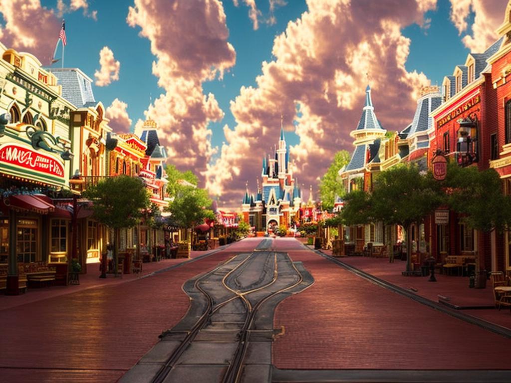Hot-gerbil221: Immerse yourself in the enchanting Main Street, USA at Walt Disney World's Magic Kingdom with a mesmerizing digital artwork created using Unreal Engine. This hyperrealistic portrayal transports you to a nostalgic