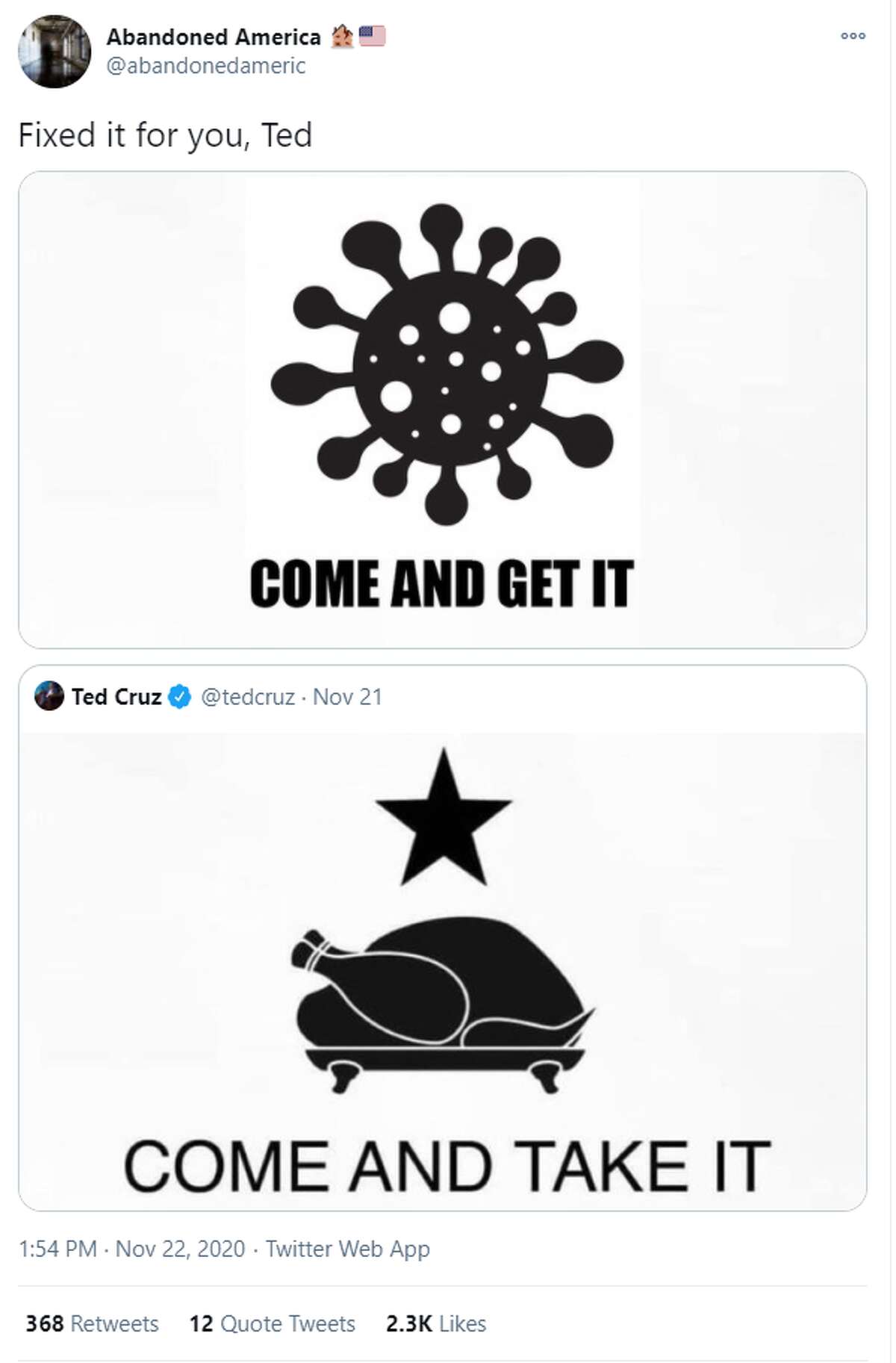 Texas artist responds to Ted Cruz's 'come and take it' Thanksgiving post with sobering tweet