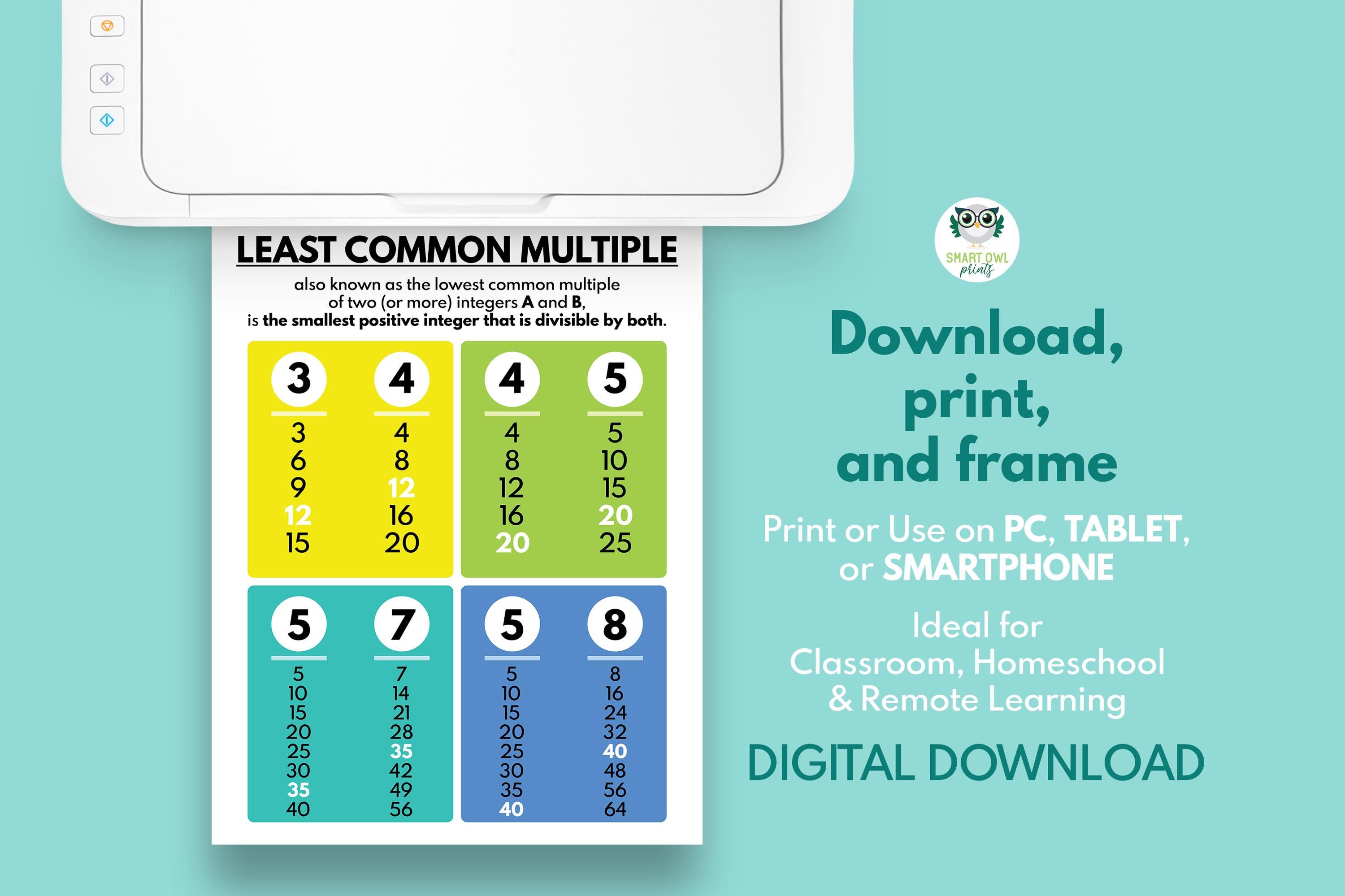 MULTIPLES MOINS COURANTS, affiche éducative, affiche de mathématiques pour les enfants, tableau d'ancrage des fractions, idées d'art mural pour la salle de classe, téléchargement numérique