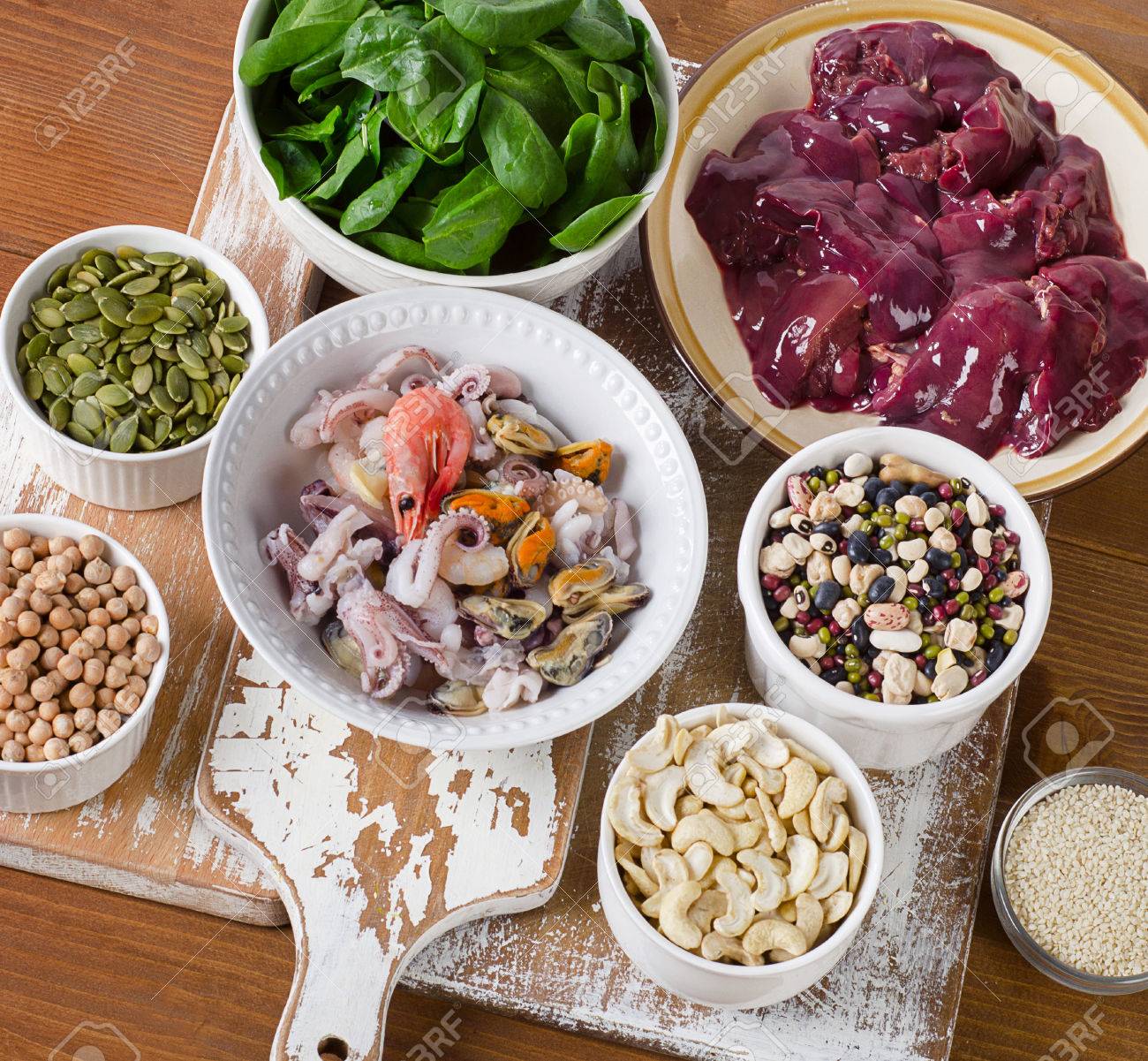 Les Aliments Riches En Fer, Y Compris Les Noix, Les Épinards, Les Haricots, Les Fruits De Mer, Le Foie. Vue De Dessus Banque D'Images et Photos Libres De Droits. Image 55560072
