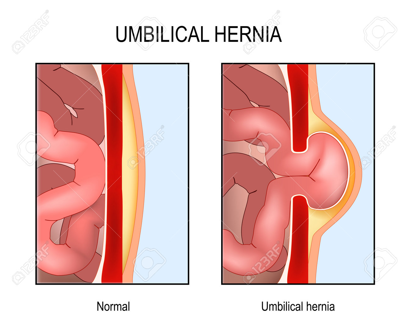 Hernie Ombilicale. Coupe Transversale De L'abdomen Avec L'intestin Grêle, Les Muscles Et La Paroi Abdominale. Ventre Humain Normal Et Rupture Musculaire Avec Sac Herniaire. Affiche De Vecteur Clip Art Libres De Droits,