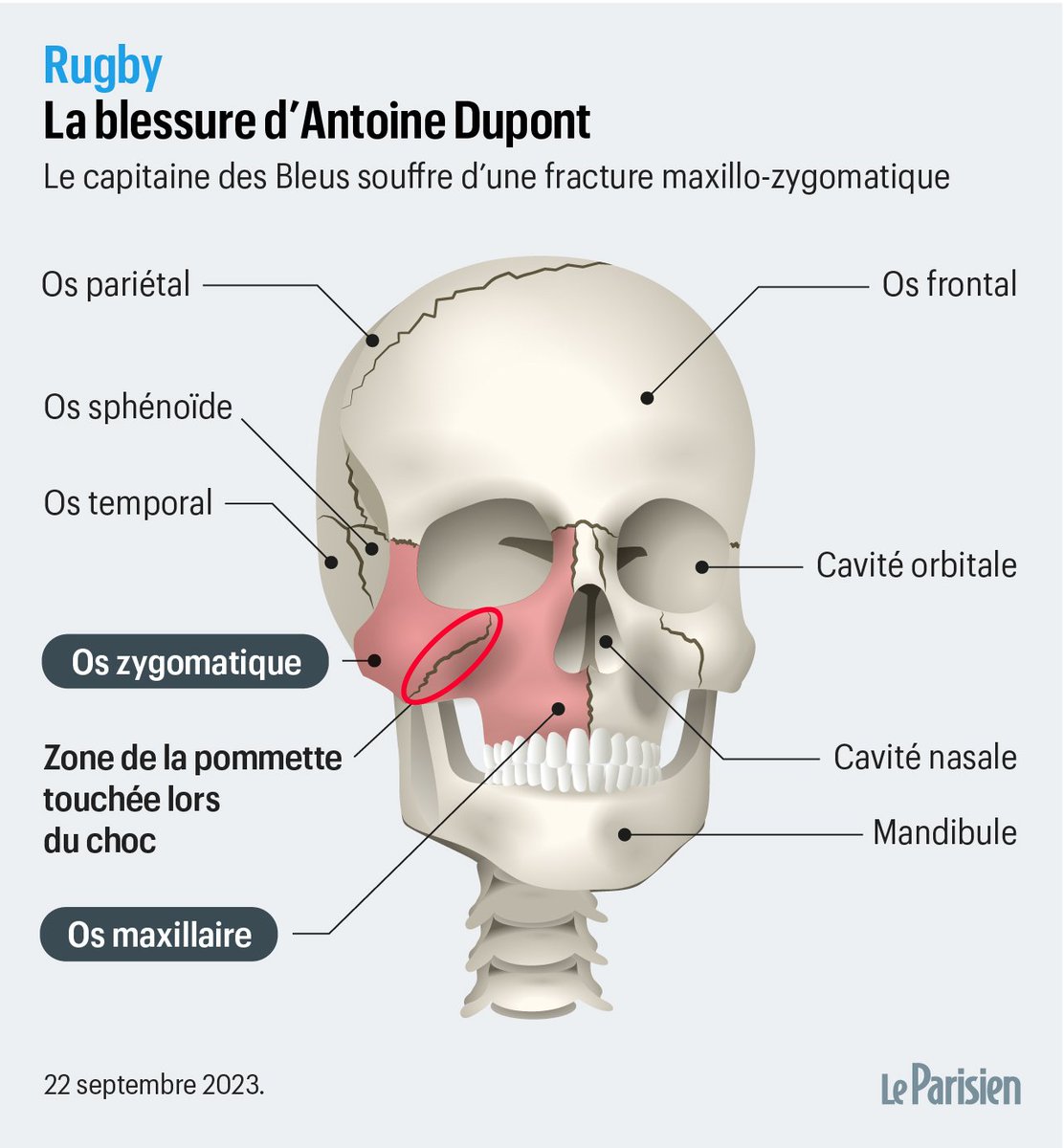 Nicolas Berrod on X: "Antoine Dupont souffre d'une fracture maxillo- zygomatique, une "fracture de la pommette, le relief osseux situé juste sous l'œil". Sa durée d'indisponibilité dépendra beaucoup d'une éventuelle opération, on risque "
