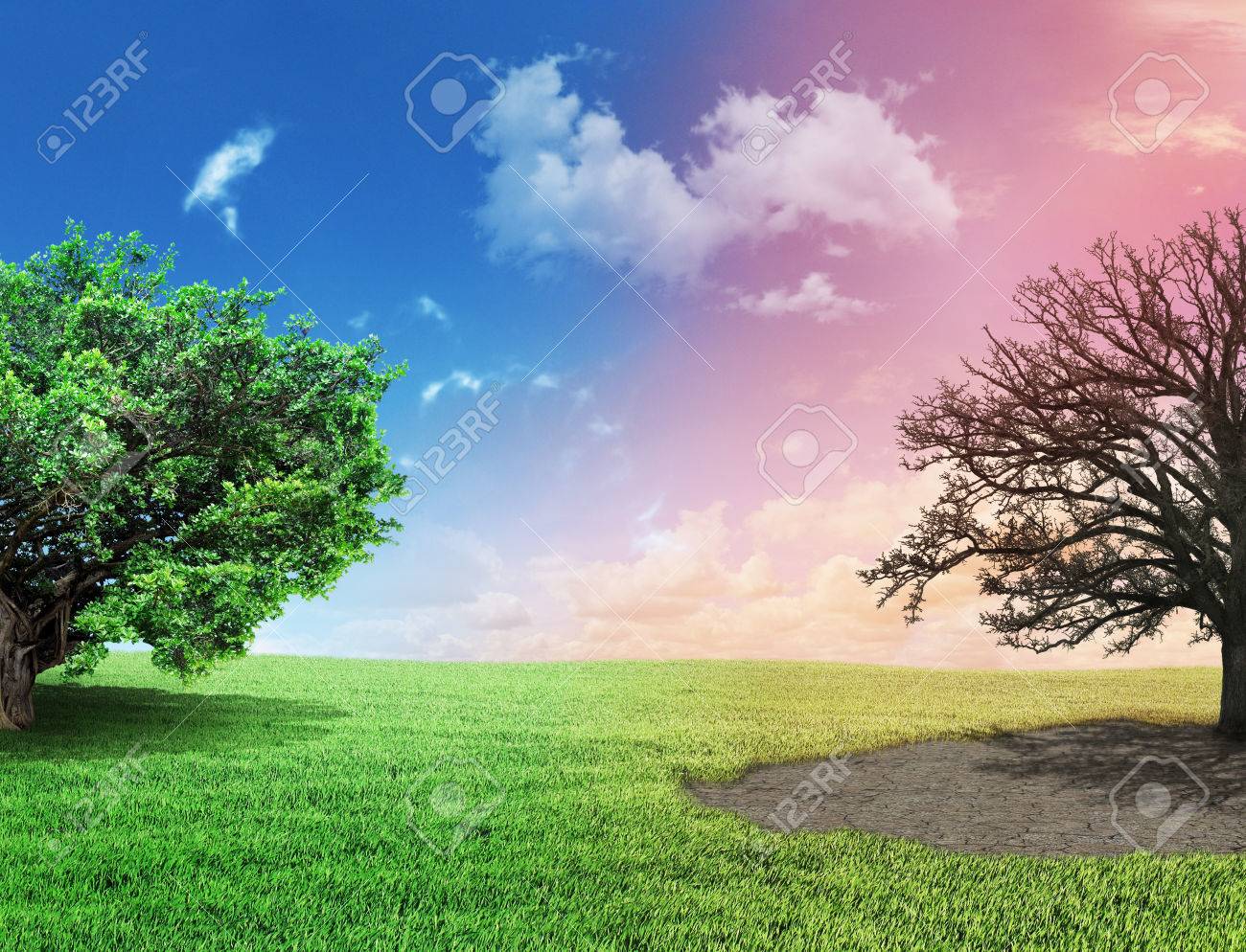 Un Côté Plein D'herbe Avec Un Arbre De La Vie, Le Côté Différent Est Le Désert Avec Un Arbre Mort. Banque D'Images et Photos Libres De Droits. Image 60016193