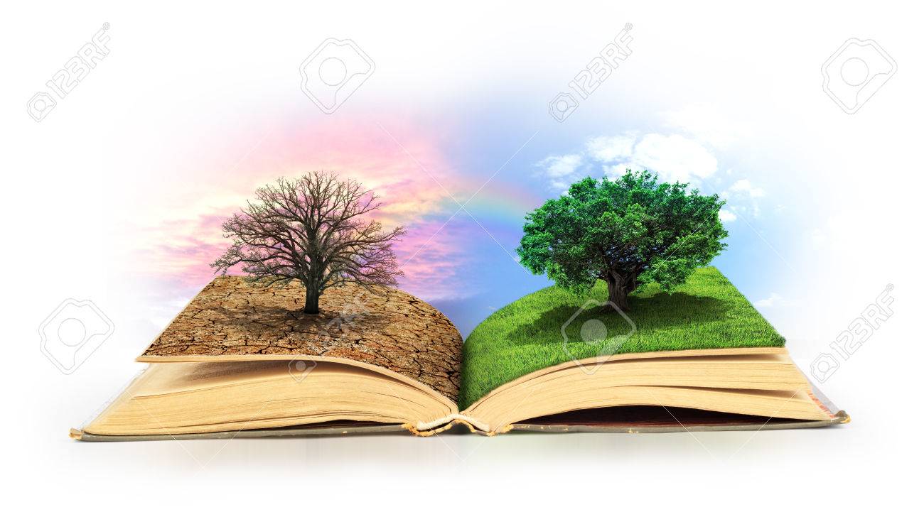 Livre Ouvert. Un Côté Plein D'herbe Avec Un Arbre De Vie, Un Côté Différent Est Le Désert Avec Un Arbre Mort. Banque D'Images et Photos Libres De Droits. Image 60016194