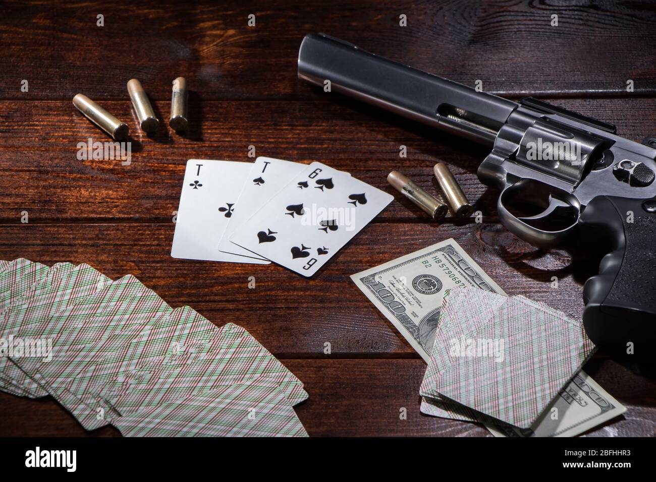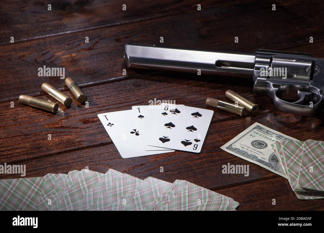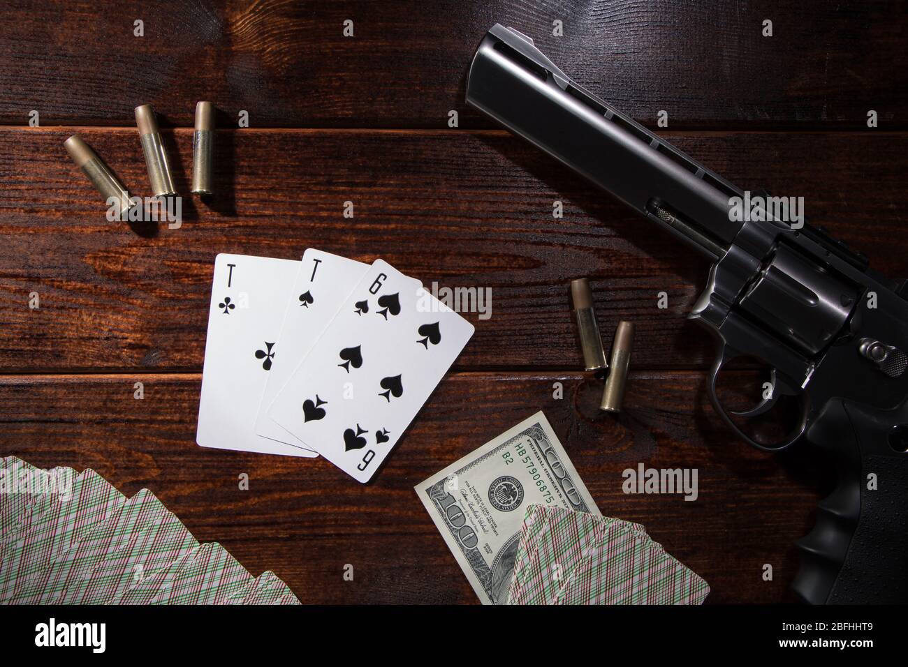 Jouer au poker ou au blackjack pour l'argent. Sur une table en bois se trouvent un pistolet avec des cartouches, des dollars de trésorerie, et une terrasse de cartes de jeu avec