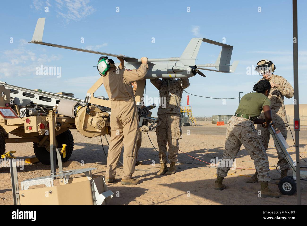 Les Marines des États-Unis affectés au Marine Unhabitée Aerial Vehicle Squadron 2, Marine Aircraft Group 14, 2nd Marine Aircraft Wing, préparent un Blackjack RQ-21A pour le lancement du cours 1-23 au Canon