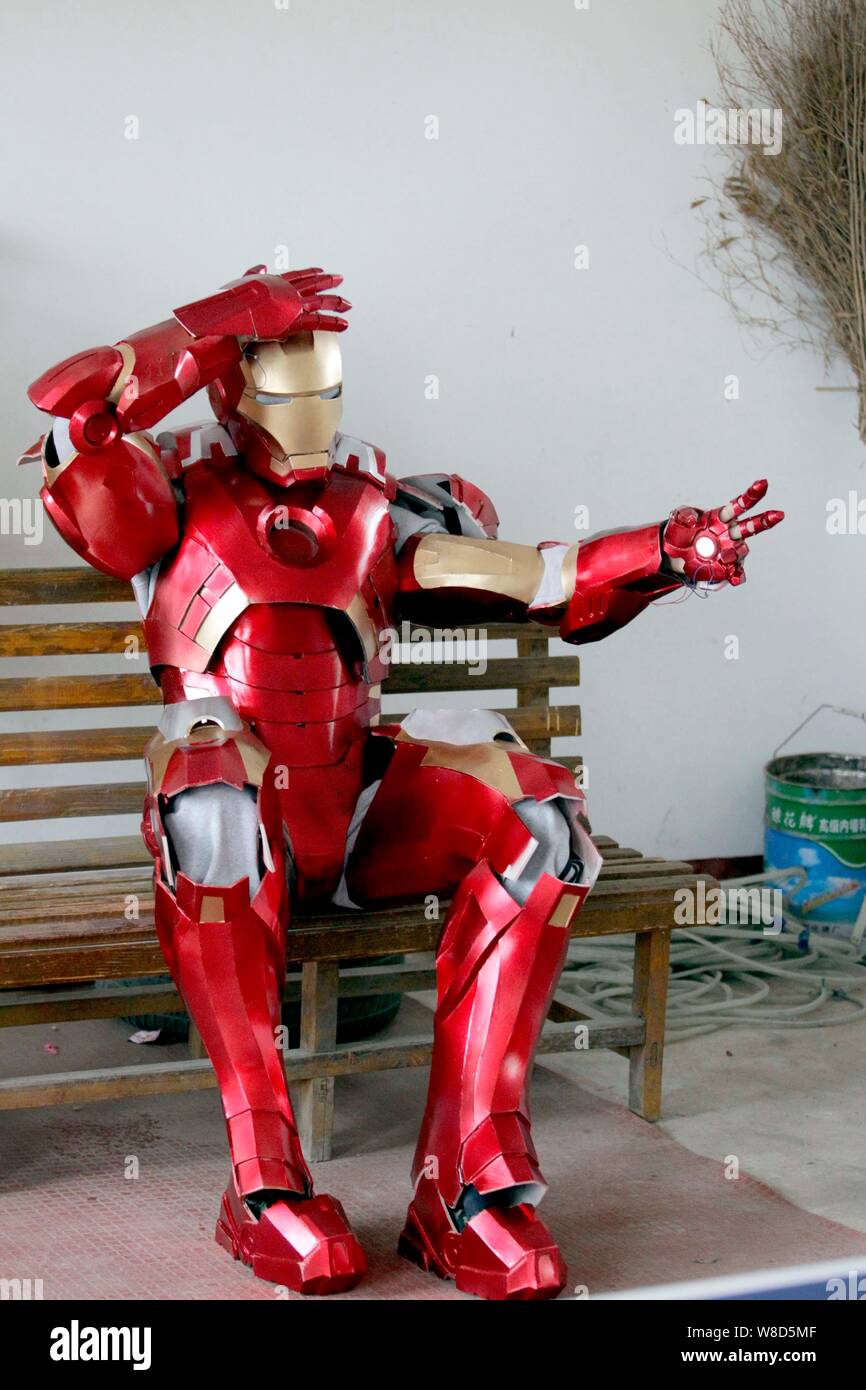 Un ami de l'homme de fer 'Chinois' fan Cheng Chen Cheng, est habillé en armure d'Iron Man en plastique fait maison à son domicile à Shanghai, de Jiangsu est p Photo Stock -
