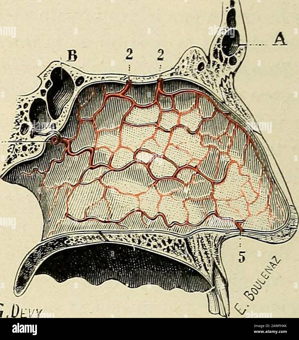Traité d'anatomie humaine . X...â. Fig. 109.Artères des fosses nasales, paroi externe. GÛL V Fig. 110.Artères des fosses nasales, paroi interne. 1, artère sphéoo-palatine, — i2, artères ethmoïdales antérieure et postéieure. —