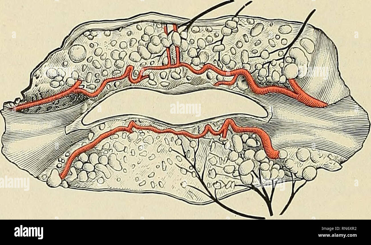 Anatomie, descriptif et appliquée. L'anatomie. 594 LES SYSTÈMES VASCULAIRES 8la coronaire labiale (Figs. 438 et 439) est dérivé de l'artère faciale, près de l'angle de la bouche ; il les transmet