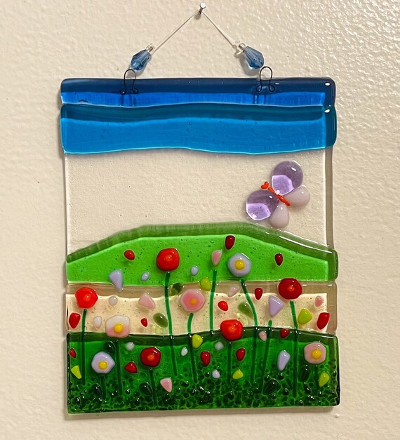 Suncatcher en verre fondu, fleurs avec décor mural papillon, art du verre de champ de coquelicots, panneau de fenêtre en verre, coquelicots de Californie - Etsy France