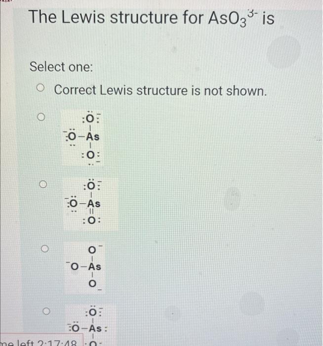 Solved The Lewis structure for AsO3³ is Select one: O | Chegg.com