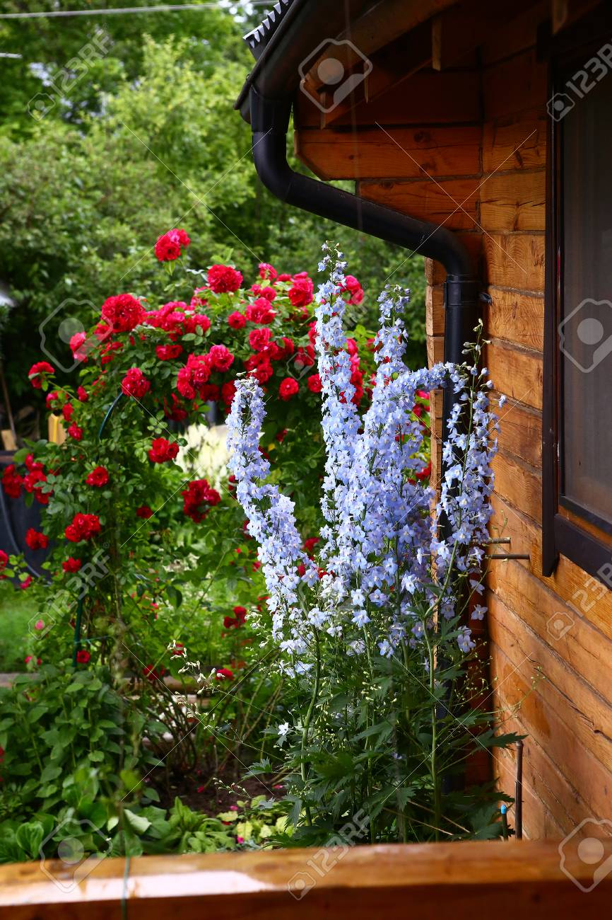 Fleurs De Delphynium Et De Roses Rouges Dans Le Beau Jardin Européen Formel Bouchent Photo Du Porche De Maison Cottage Banque D'Images et Photos Libres De Droits. Image 62494293