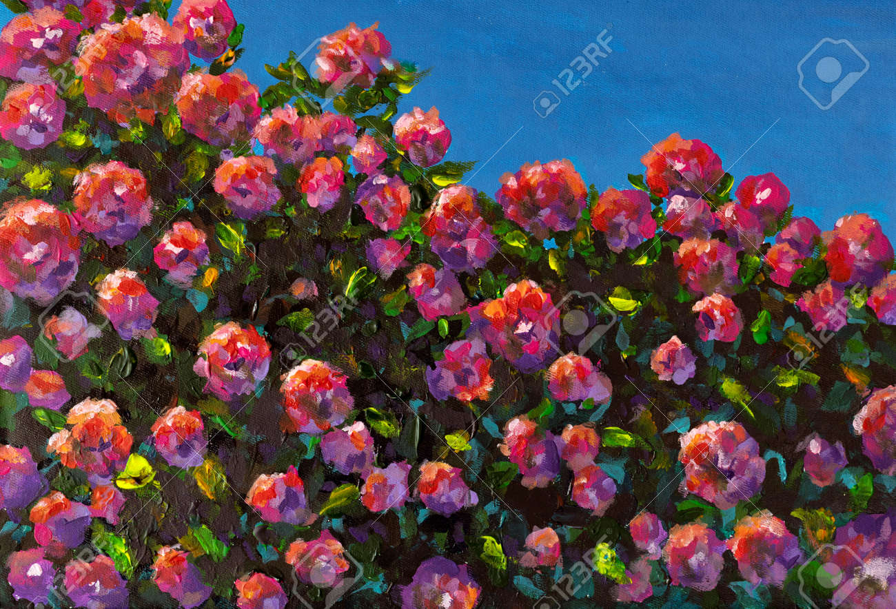 Fleurs De Peinture À L'huile, Beau Jardin De Fleurs De Buisson De Roses Roses Sur Toile. Fleurs De Pivoine Rouge Impressionniste Dans Des Feuilles Vertes Contre Des Illustrations De Ciel Bleu. Banque