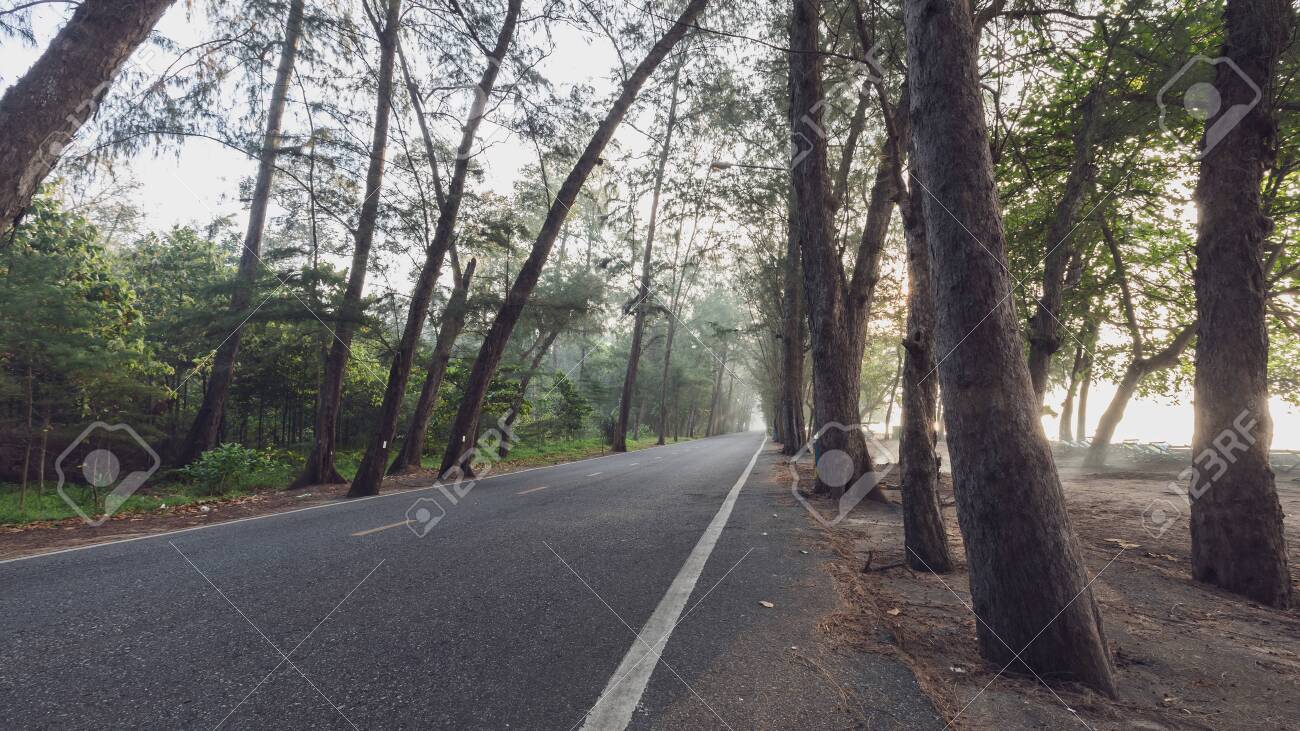 Belle Route De Campagne Calme Avec Pin Ombragé Sur Le Bord De La Route Au Lever Du Soleil Du Matin Banque D'Images et Photos Libres De Droits. Image 132460537