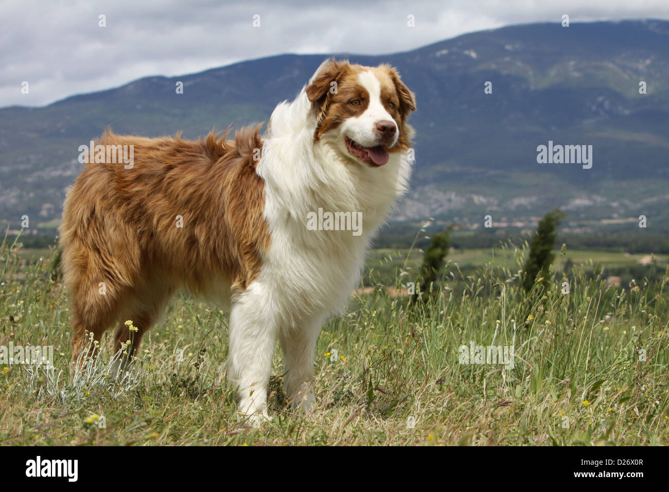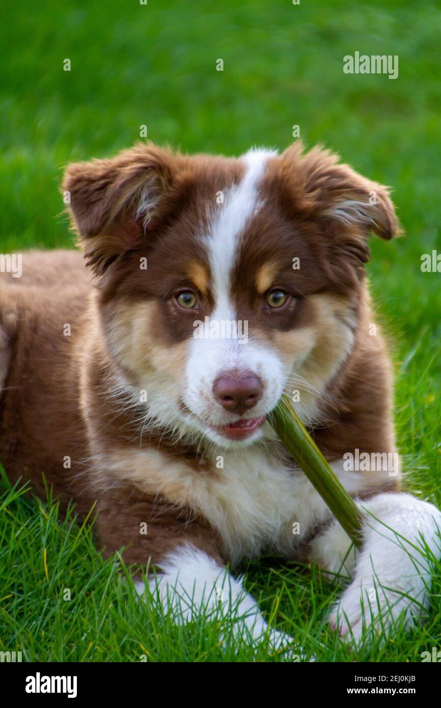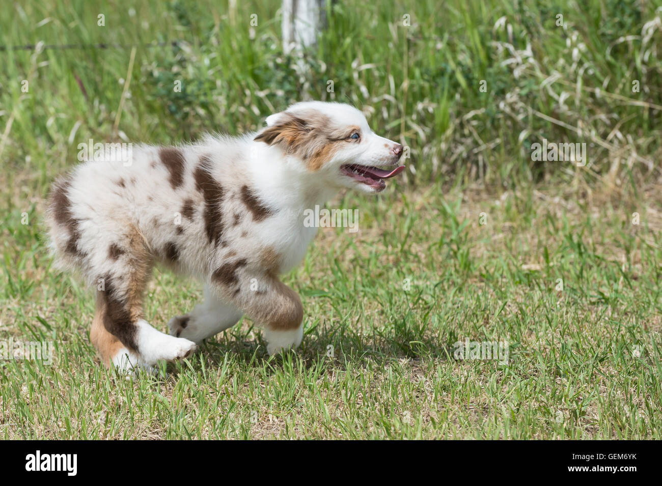 Chien, jeune Berger australien de trois mois de couleur rouge merle. Ce sont les agriculteurs américains qui ont développé la race dans les années 1900 Photo Stock - Alamy