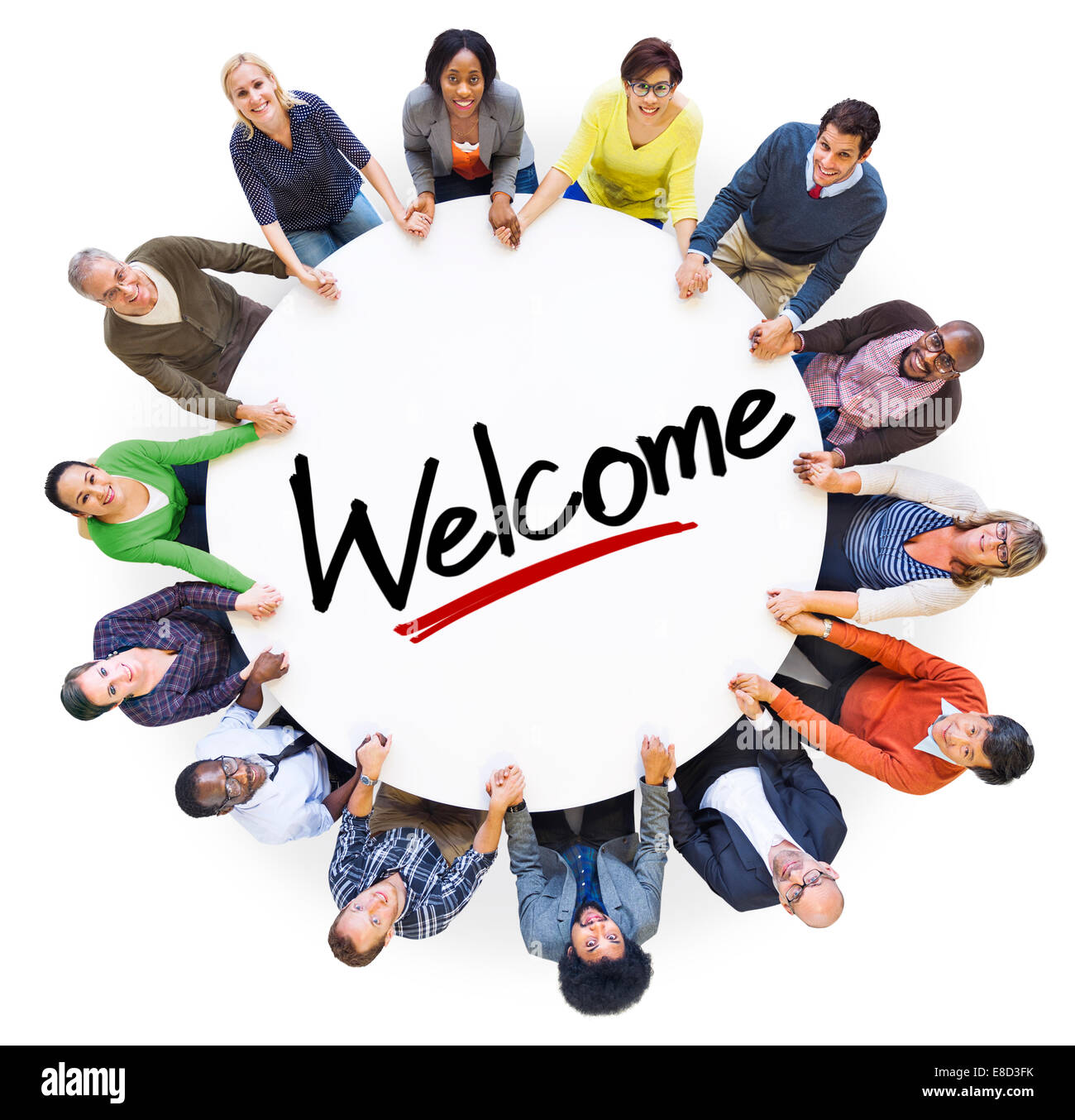 Groupe de personnes se tenant la main autour du mot Bienvenue Photo Stock - Alamy