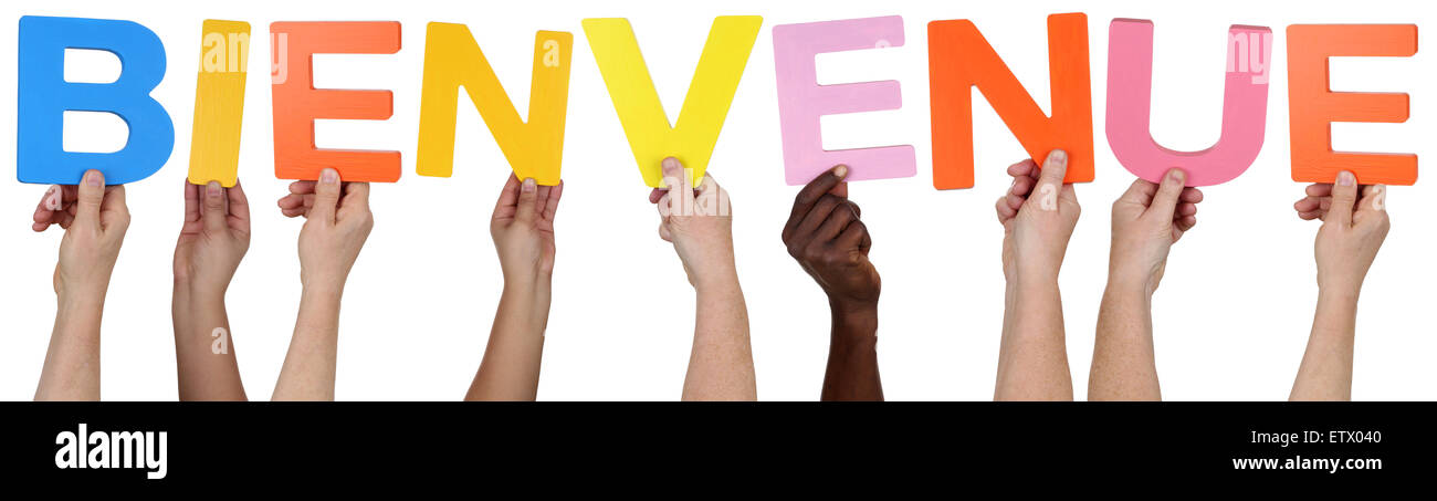 Multi Ethnic groupe de personnes détenant le mot français bienvenue welcome isolated Photo Stock - Alamy