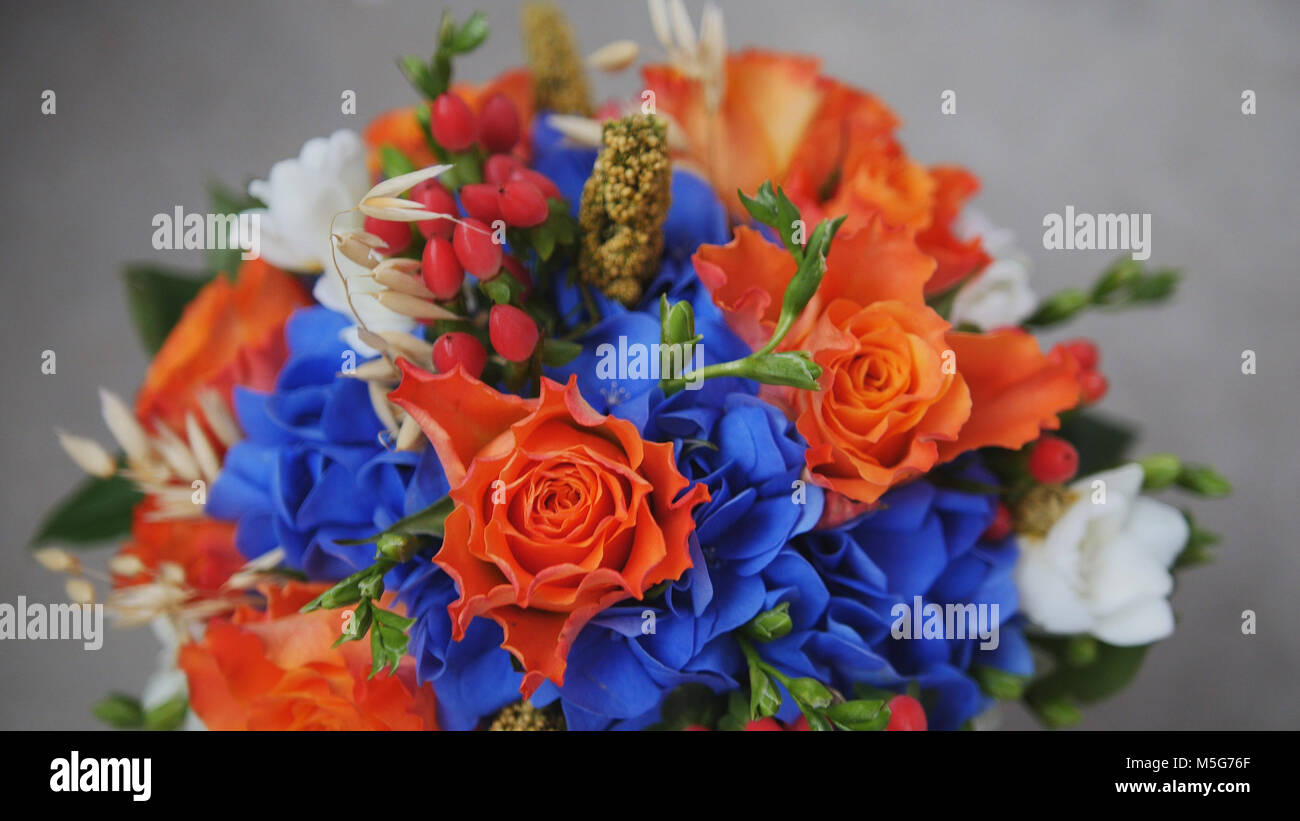 Bouquet de mariage sur une surface grise - roses rouges et fleurs bleu Photo Stock - Alamy