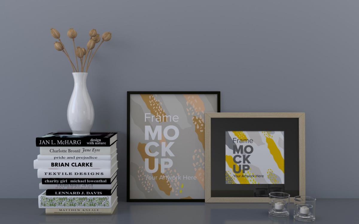 Un gros plan de cadres avec des livres sur le modèle de maquette d'étagère