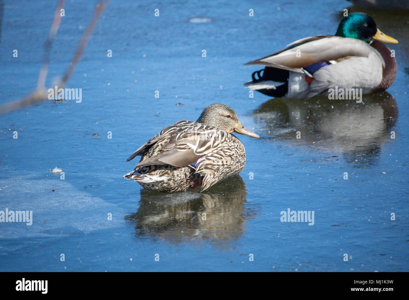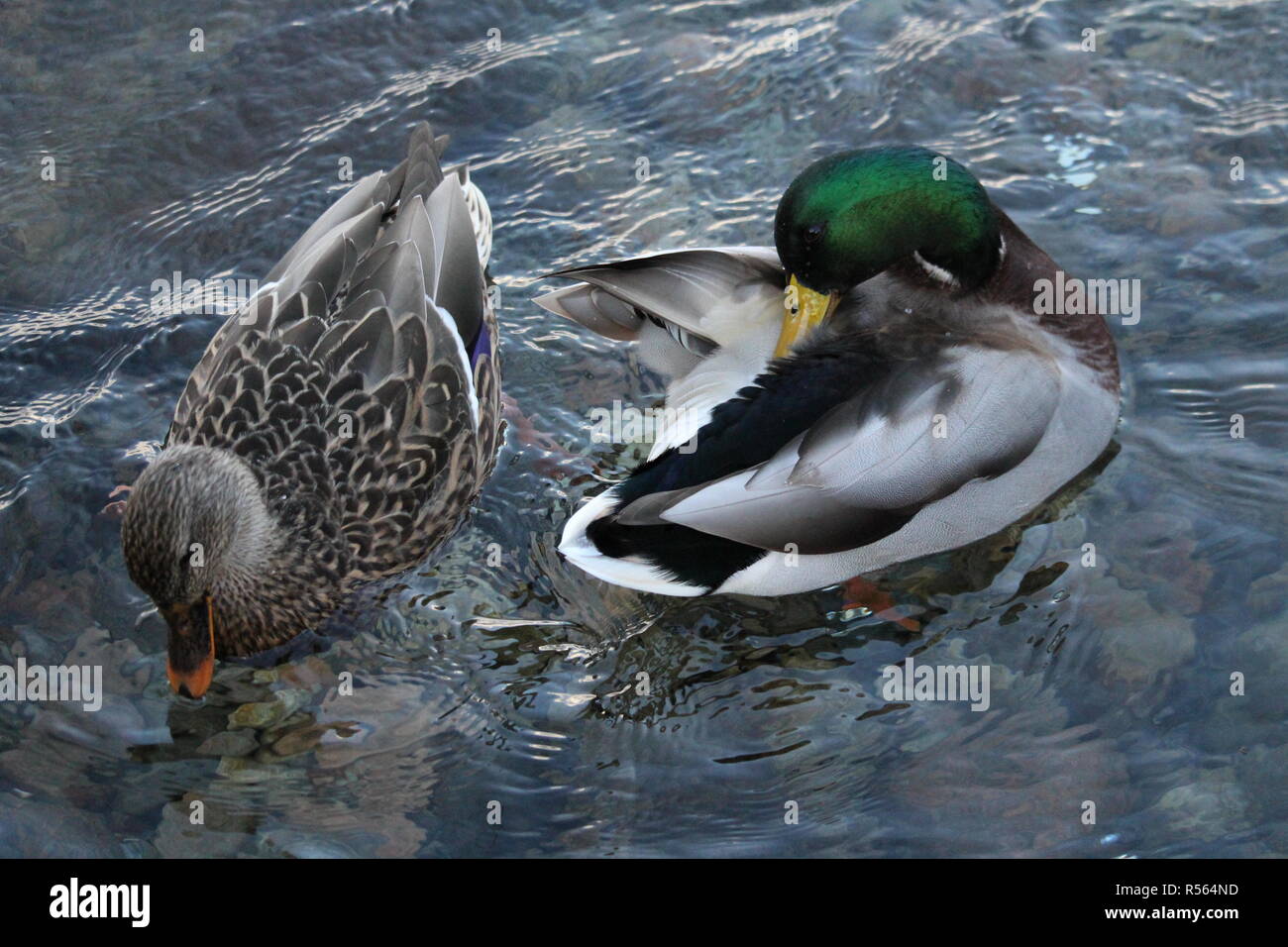 Paire de Canards colverts sauvages qui se coupent dans l'eau, le mâle saisit le cou de la femelle avec son bec et force la tête sous l'eau, Allemagne Photo Stock - Alamy