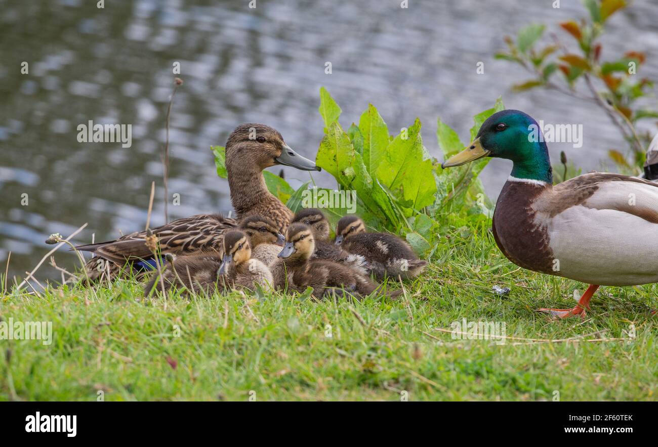 Une famille de canards colvert. Un canard de drake et de poule avec leur famille de canetons Photo Stock - Alamy