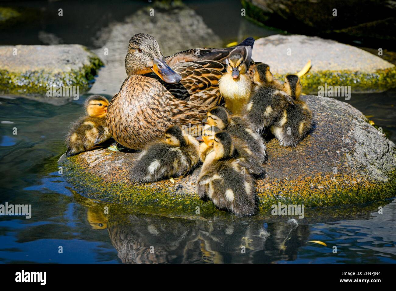 Canard colvert et canetons sur la roche, parc Queen Elizabeth, Vancouver (Colombie-Britannique), Canada Photo Stock - Alamy