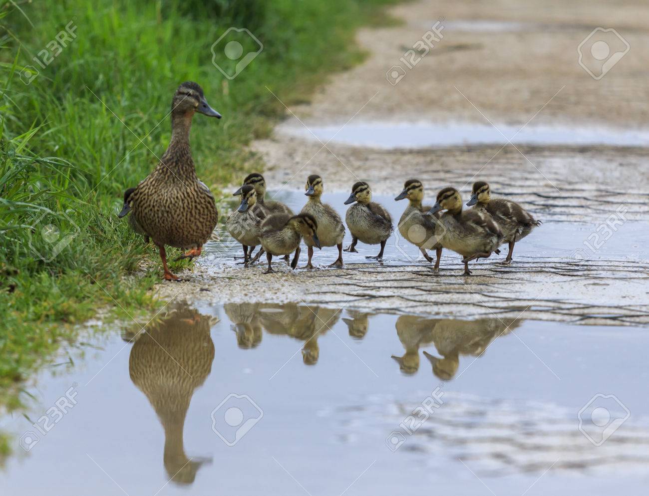Canard Et Canetons Sur Un Chemin, Reflétés Dans Un Bassin D'eau Banque D'Images et Photos Libres De Droits. Image 24525267