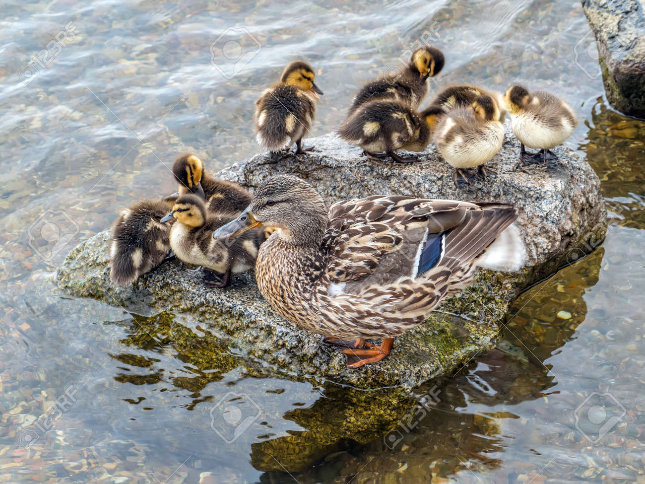 Le Canard Colvert Et Ses Canetons Sont Assis Sur Une Pierre Au Bord De L'eau Banque D'Images et Photos Libres De Droits. Image 188228939