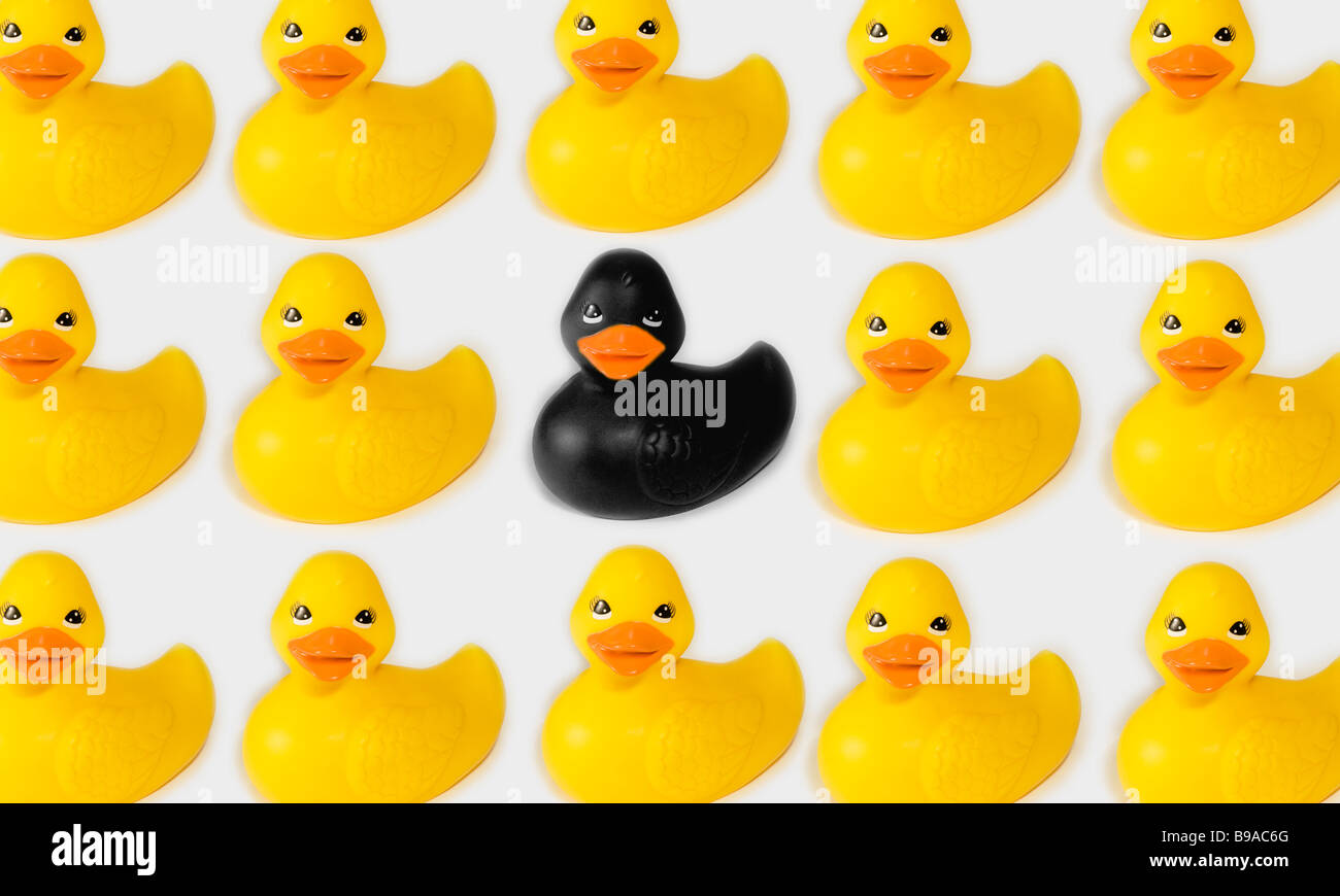 Un canard en caoutchouc noir entre de nombreux canards en plastique jaune Photo Stock - Alamy