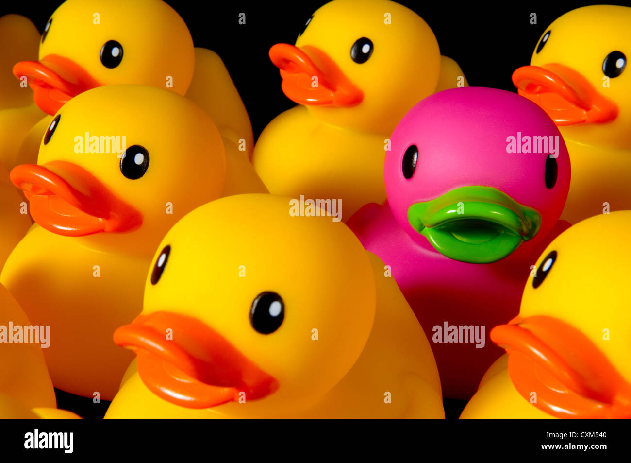 Canard en caoutchouc violet entouré de canards en plastique jaune pour souligner l'individualité- sur fond noir Photo Stock - Alamy
