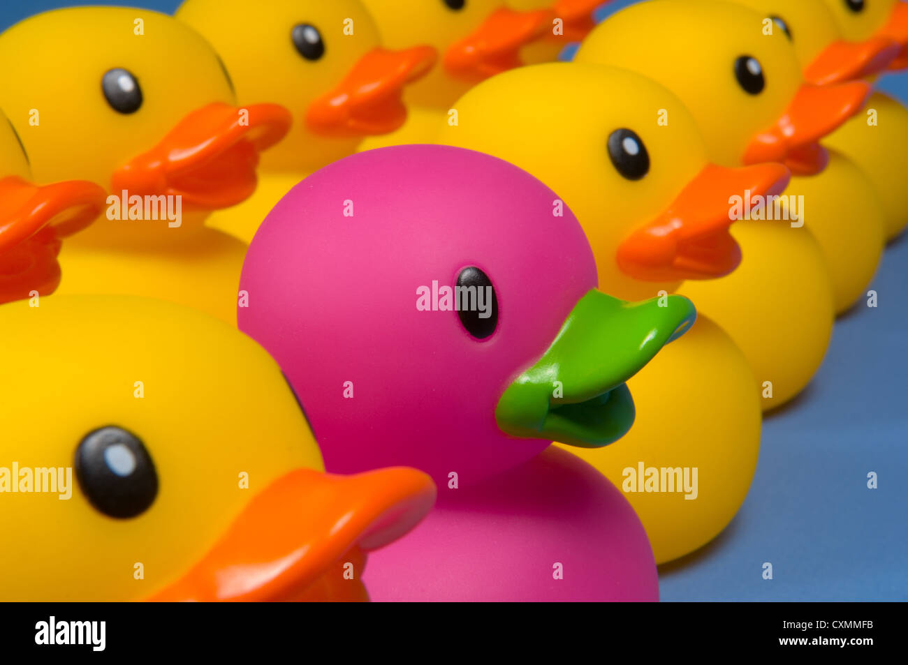 Photo libre de droit de Grand Groupe De Canards En Caoutchouc Jaune En Rangées Formelles Avec Un Canard Individuel Différent Qui Se Démarque De La Foule Étant De Couleur Violette banque d'images