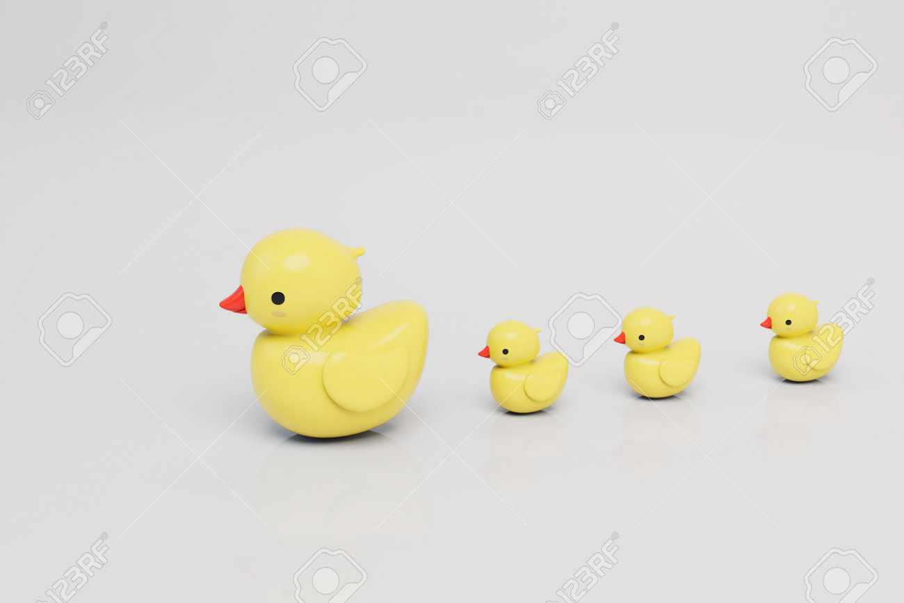 Un Grand Canard En Caoutchouc Avec De Petits Canards De Couleur Jaune Sur Fond Blanc Rendu 3d Banque D'Images et Photos Libres De Droits. Image 192348689