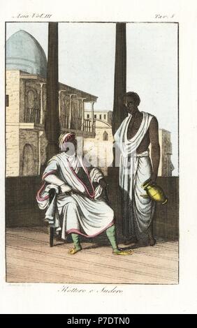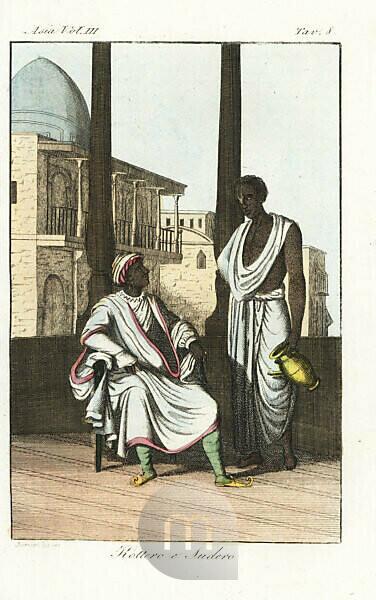 Bildagentur | mauritius images | Warrior prince (Kshatriyas) or Rajput with servant (sudras) in a room with a view of a mosque with dome, Rajasthan, early 19th century. Handcoloured copperplate engraving drawn