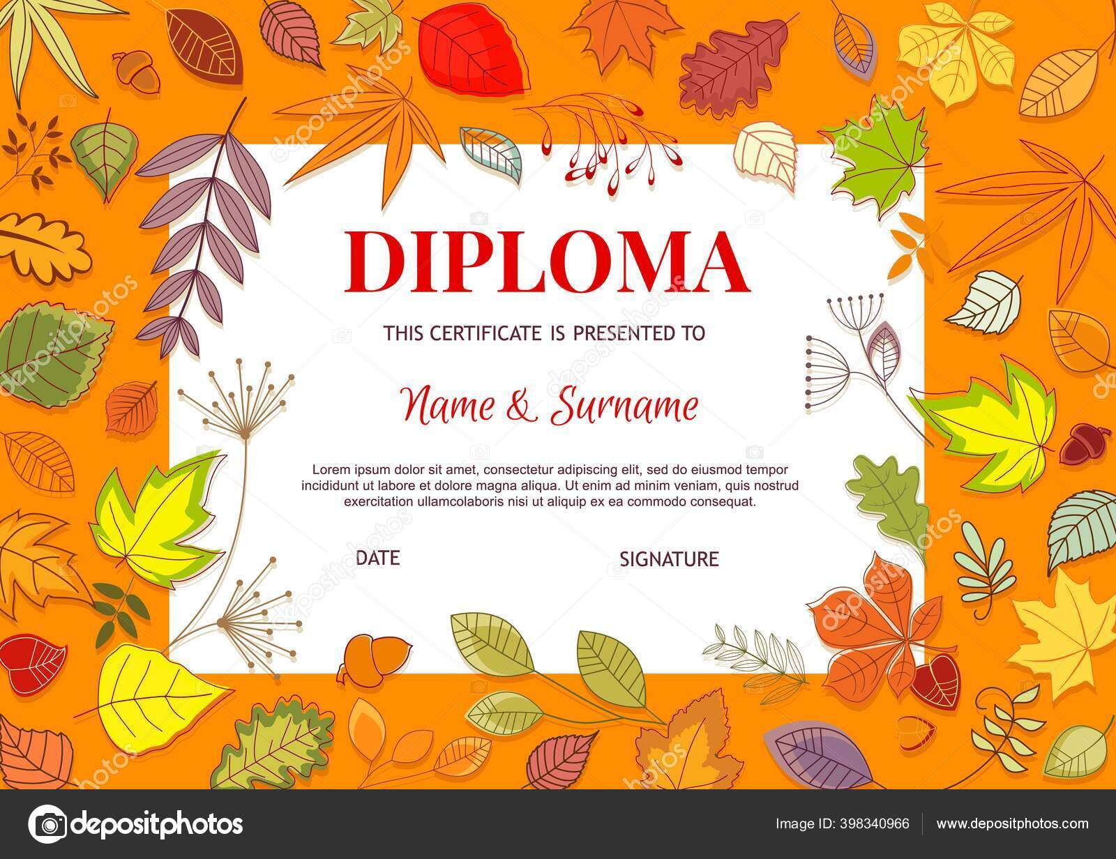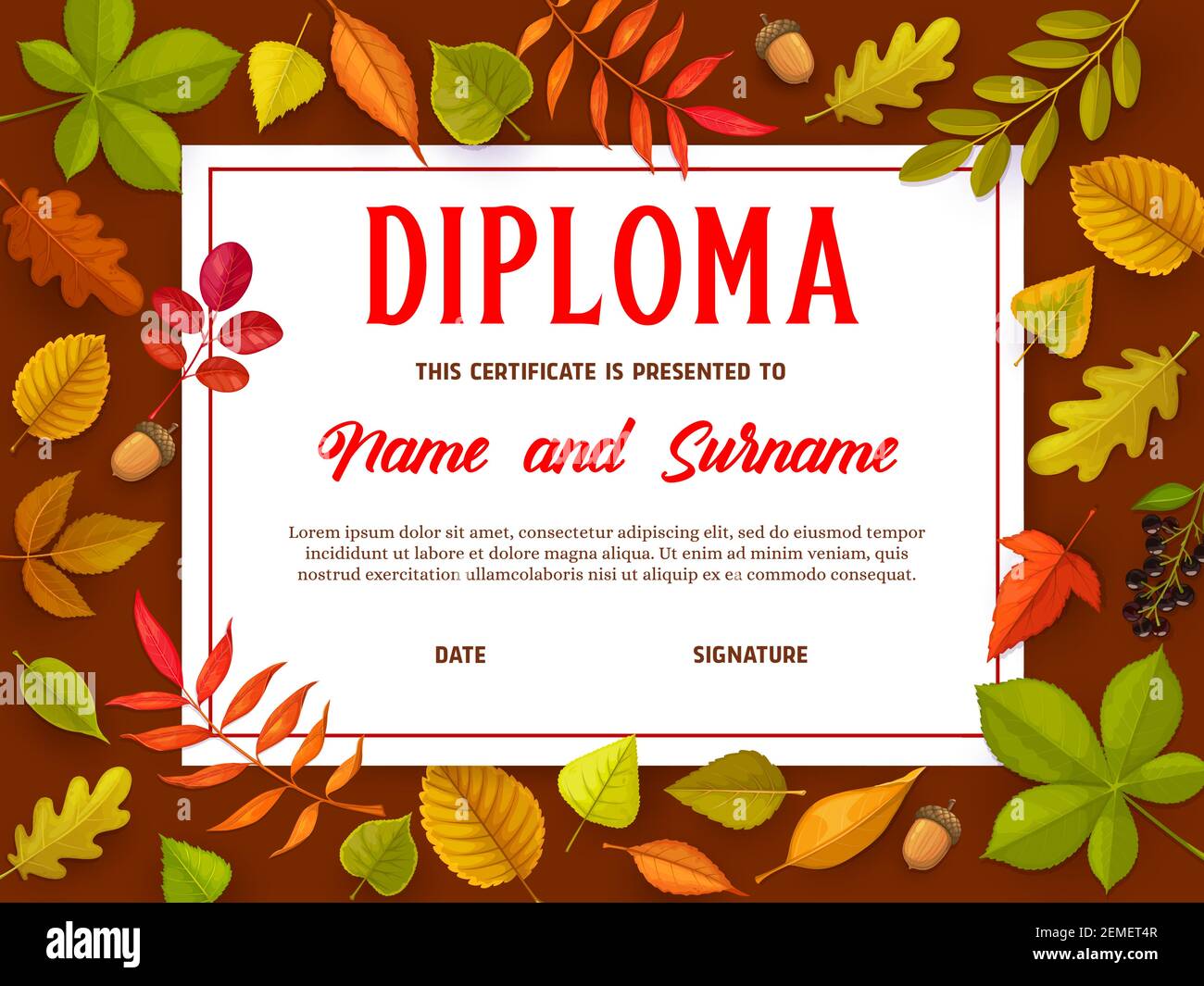 Certificat d'éducation avec feuilles d'automne, diplôme pour enfants pour l'école ou modèle de vecteur de maternelle. Prix enfant design de la frontière, diplôme de participation Image Vectorielle Stock - Alamy